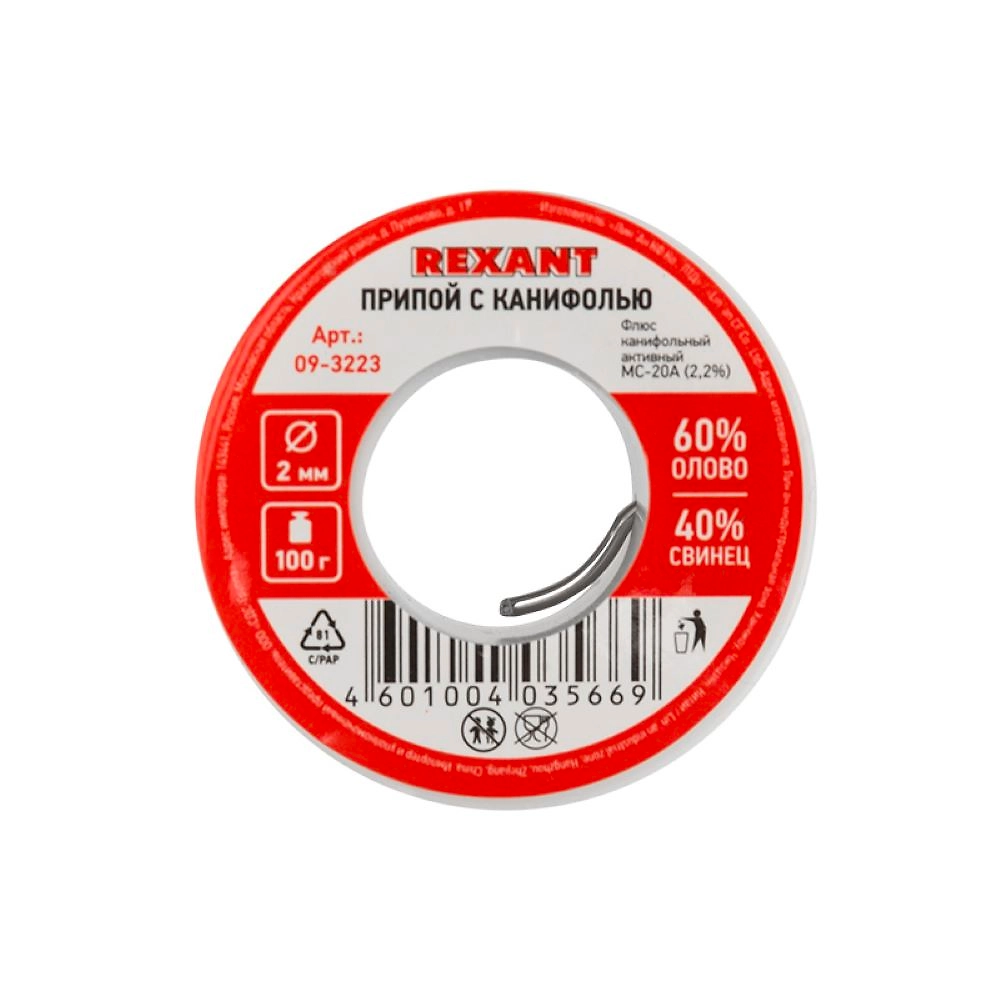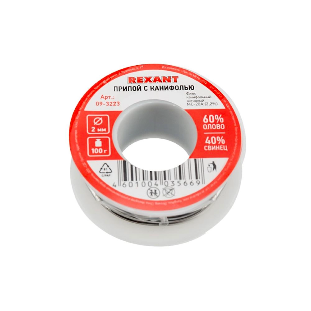 Припой с канифолью REXANT представляет собой проволоку (диаметром 2 мм) из сплава олова (60 %) и свинца (40 %).