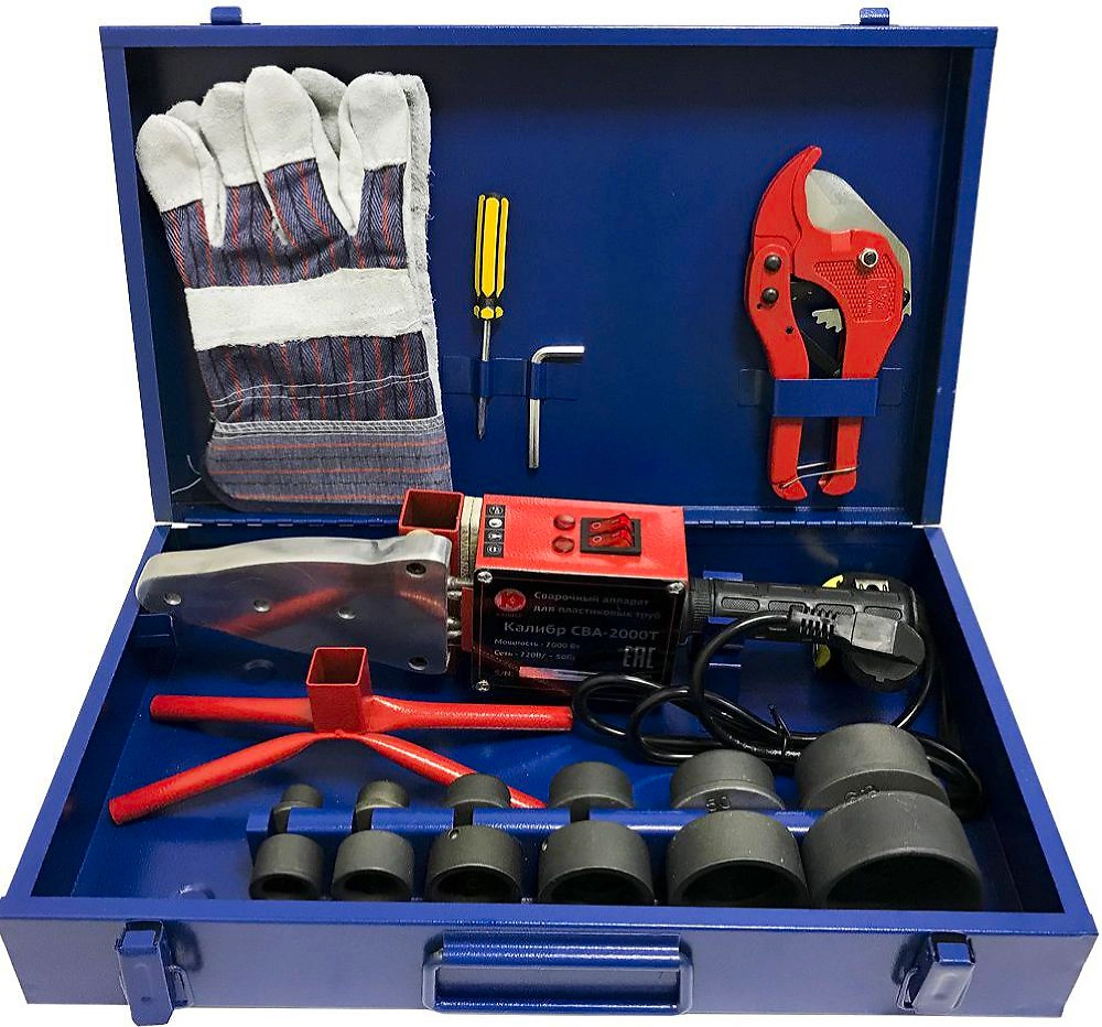 Ручной сварочный аппарат Калибр СВА-2000Т предназначен для сварки в раструб полипропиленовых труб небольшого диаметра с достаточной толщиной стенок. Сварка в раструб - соединение торцов двух труб с помощью фитинга (муфты), охватывающего место скрепления снаружи. В комплект поставки входят парные насадки: одна нагревает наружную поверхность трубы, вторая - внутреннюю поверхность фитинга. Парные насадки являются основным рабочим инструментом сварочного аппарата. Установленный в аппарате термостат (терморегулятор) осуществляет включение/отключение и устанавливает температуру нагревательного элемента (ТЭНа). Клавишами на корпусе включаются два режима нагрева ТЭНа: одна клавиша - 1000 Вт, две клавиши - 2000 Вт.Термостат поддерживает (в интервале от 50 до 300 градусов) выставленную температуру в автоматическом режиме. Между кронштейном и корпусом устанавливаются текстолитовые прокладки, предохраняющие корпус от нагрева. В комплект поставки входят ножницы для резки труб, термостойкие рукавицы, рулетка, наладочный инструмент.
