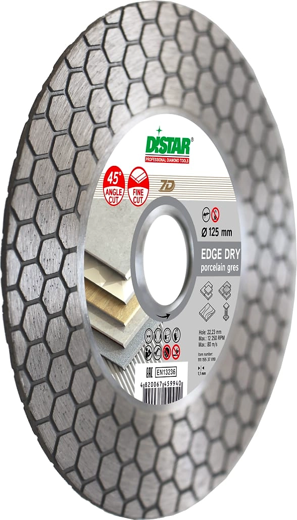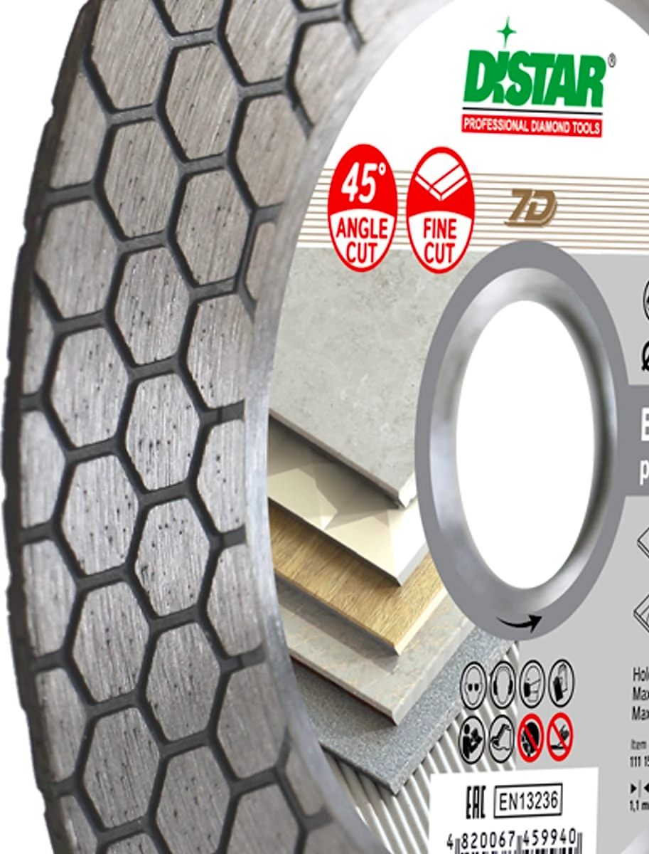 Именно такими свойствами и обладает диск Edge Dry. Широкий двухсторонний алмазоносный слой 25 мм армирует корпус, делает его жестким. В то же время алмазоносная связка с сотовым рисунком слоя делает резание мягким и высокопроизводительным. Большая плоскость создает эффект "опоры", направляя диск строго по прямой. Дополнительно можно подшлифовать кромку торца плитки. С таким диском заусовка 45 градусов становится сплошным удовольствием!