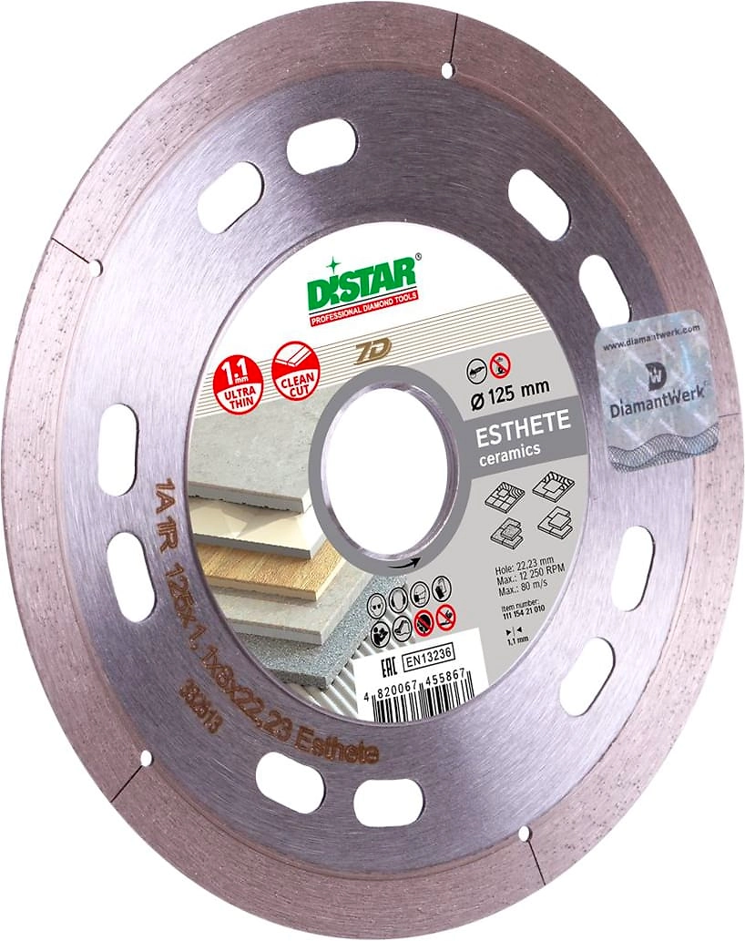 Ультра-тонкий алмазный слой 1,1 мм позволяет выполнять сверхточный, деликатный рез. За счет меньшего сопротивления материала обеспечивается легкое и быстрое резание. Оставляет чистейшую кромку на всех видах плитки, в т.ч. с глазурованным покрытием.