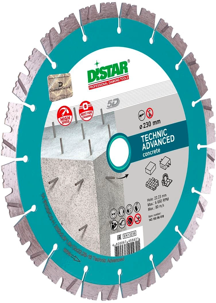 DISTAR TECHNIC ADVANCED Это универсальный диск. Разработан для выполнения работ с тротуарной плиткой, бетоном и черным гранитом. Помимо этого применяется к кирпичу, армированному бетону, песчанику цветному граниту. За свою универсальность приобрел широкую популярность в строительных бригадах.