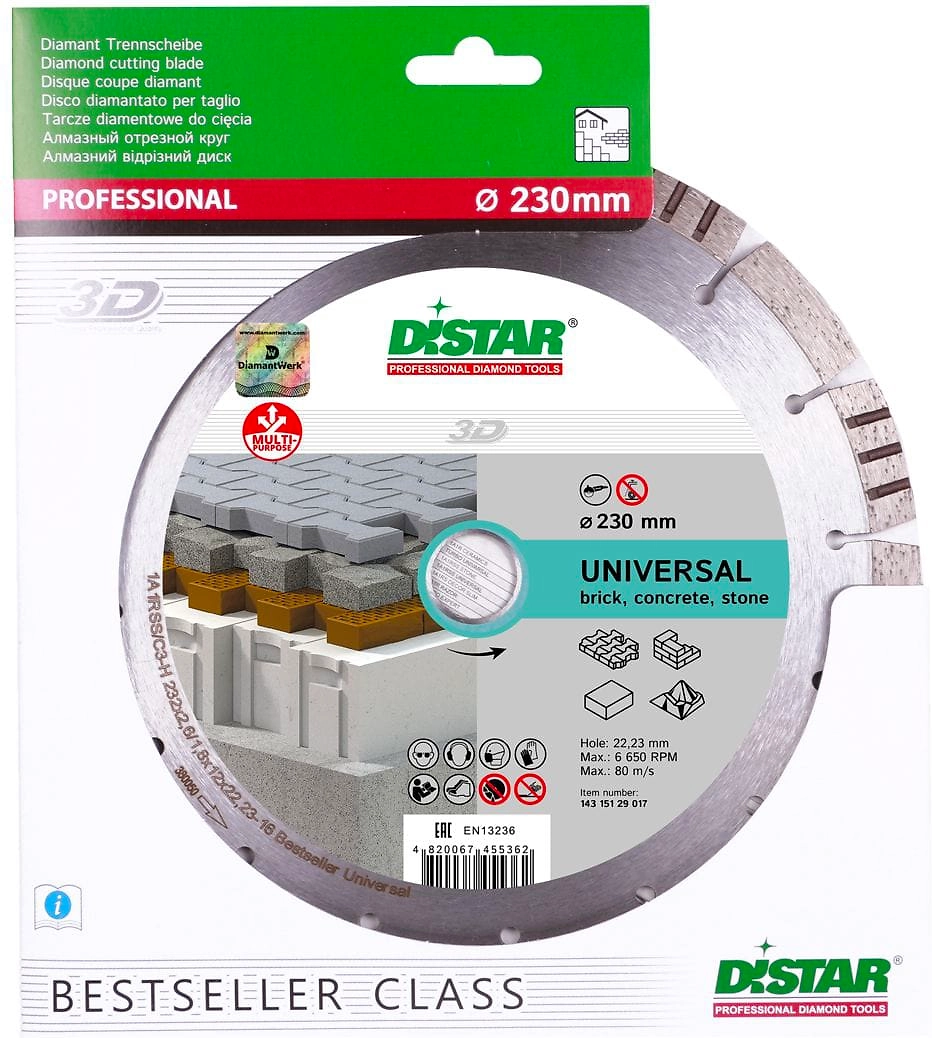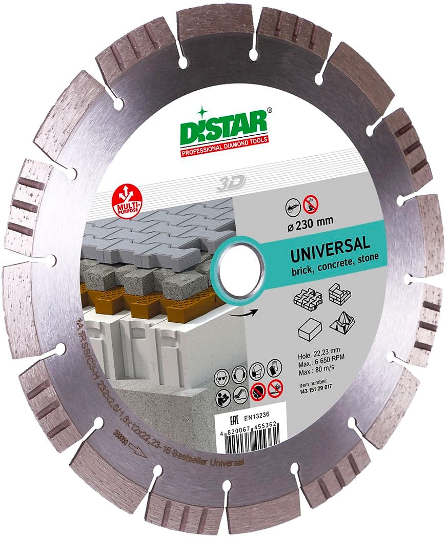Алмазный круг Distar 1A1RSS Bestseller Universal очень хорошо подходит для работы с грубыми материалами, и таким образом становится лучшим средством для резки бетона, песчаника и тротуарной плитки.