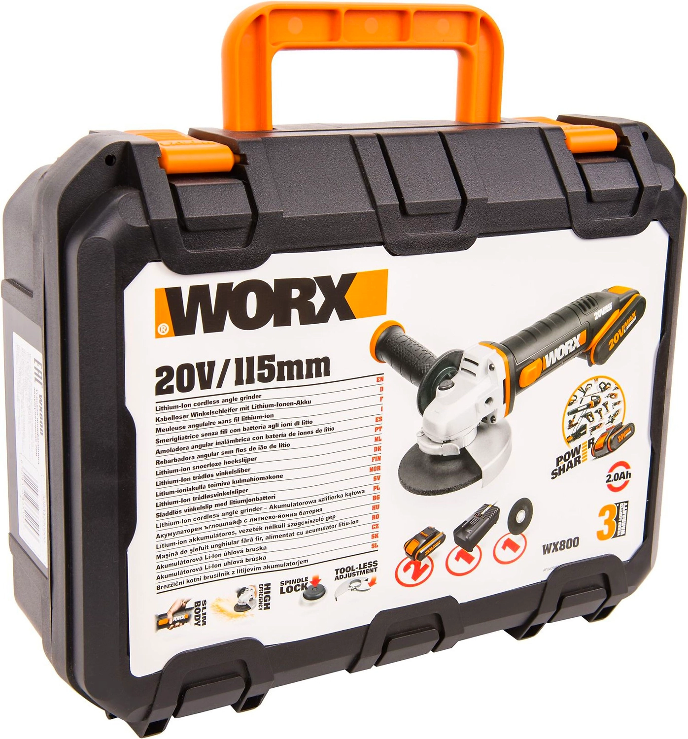 WORX WX800 - Аккумуляторная угловая шлифовальная машина (болгарка) - предназначена для шлифования и подрезания металла. Мощный двигатель работает от аккумулятора 20В, что определяет высокую производительность и скорость реза. Тонкая конструкция корпуса обеспечивает более комфортную работу оператора и способствует точному контролю над машинкой и предотвращению выскальзывания инструмента из рук. В комплекте с устройством идет дополнительная боковая рукоять. Для быстрой замены оснастки УШМ оснащена блокировкой шпинделя. Важным преимуществом данной модели является малый вес - 1,54 кг. Для защиты двигателя от перегрева данная модель оснащена специальной вентиляцией и имеет систему охлаждение двигателя. Ударопрочный корпус устройства защищает его от повреждений, а металлический корпус редуктора еще больше увеличивает надежность инструмента. Аккумулятор POWERSHARE 20 В взаимозаменяем с другими инструментами WORX.