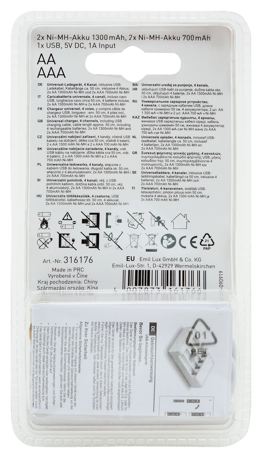 Зарядное устройство для зарядки аккумуляторных батарей, в комплекте с 4 аккумуляторными батареями 2шт x aa 1300 mah, 2 x aaa 700 mah , входное напряжение и ток: 5 в /1 a, выходное напряжение и ток: