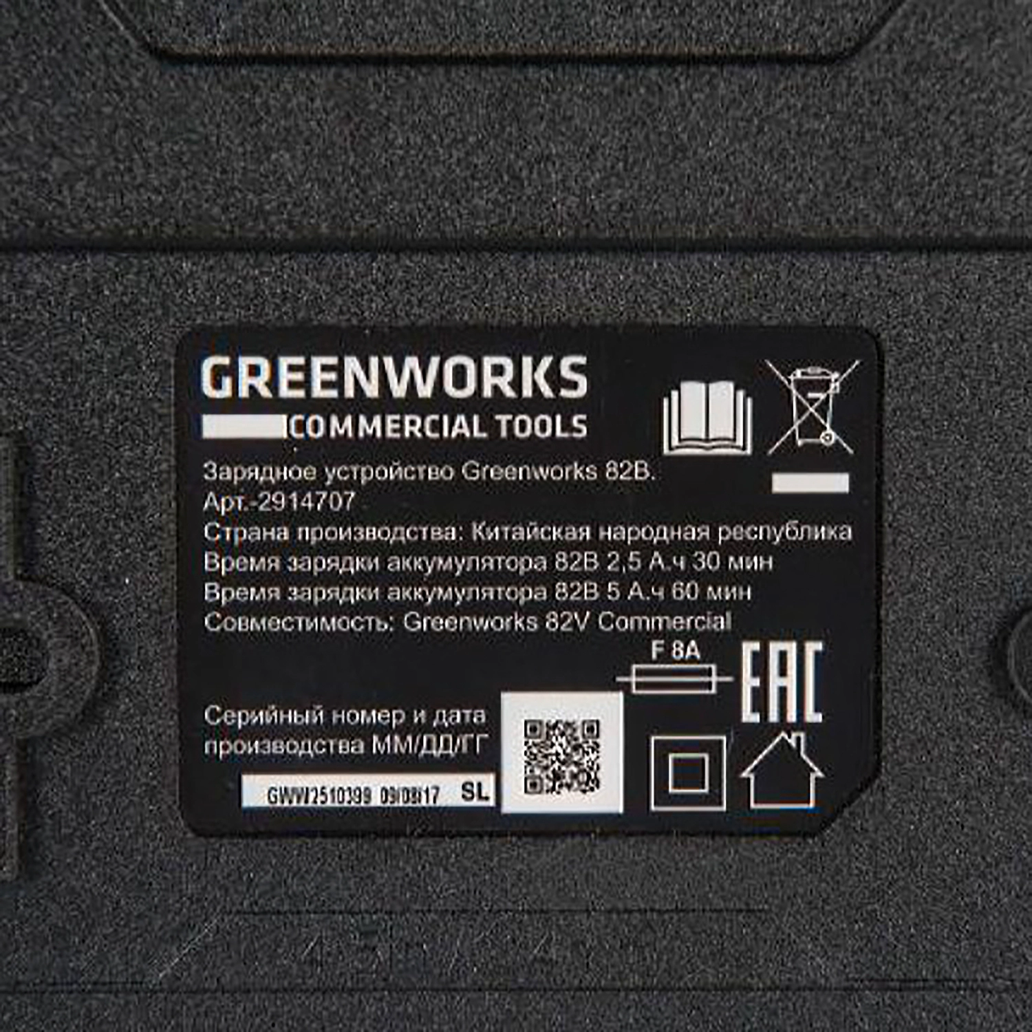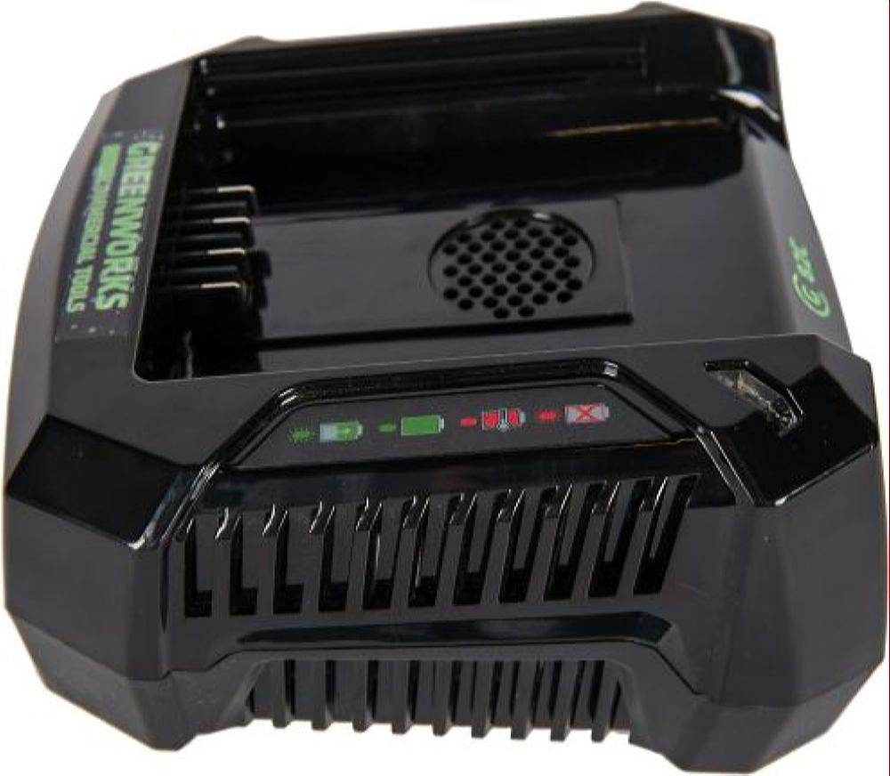 Зарядное устройство Greenworks G82C. Предназначено для зарядки литий-ионных аккумуляторных батарей G82B2 ( 2,5 А/ч арт. 2914907), G82B5 ( 5 А/ч ) и (12,5 А/ч).