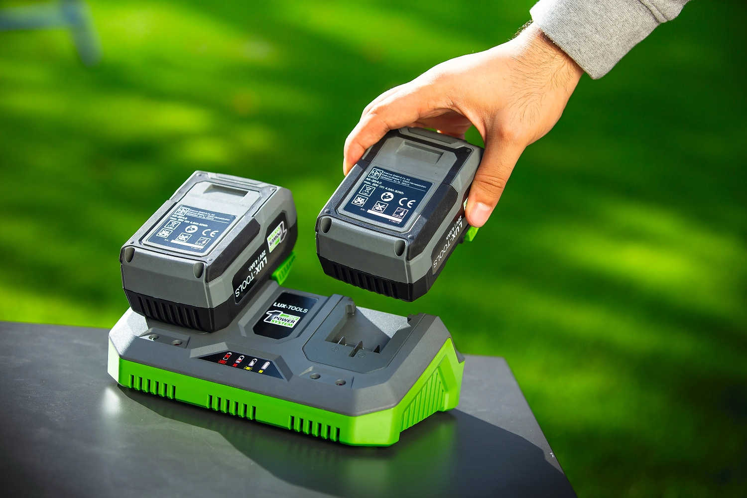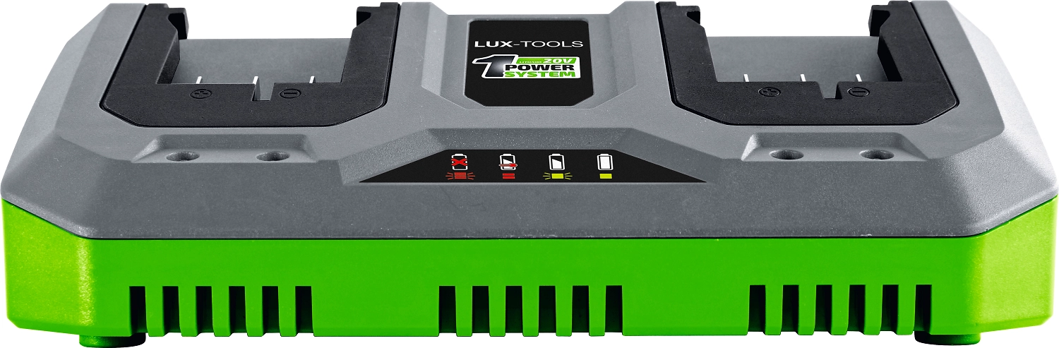 Двойное зарядное устройство от немецкой компании LUX-TOOLS используется с целью зарядки одновременно двух литий-ионных аккумуляторов, номинальное напряжение которых составляет 20 В.