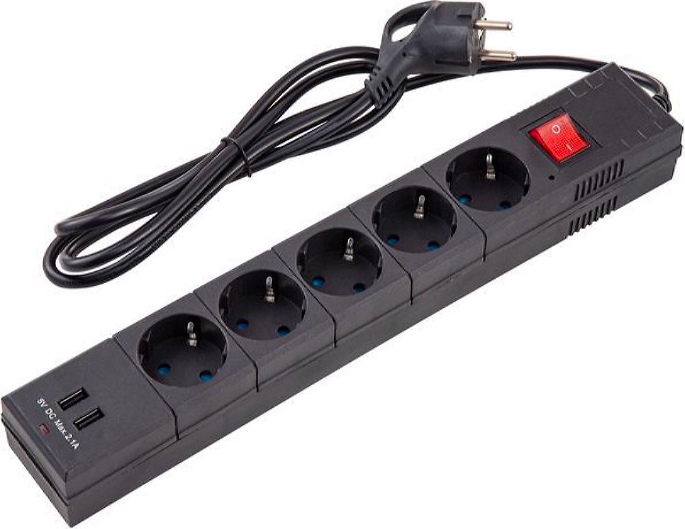 Сетевой фильтр черного цвета, имеет 5 розеток с заземлением. Также в корпусе присутствует 2 USB-порта, предназначенные для зарядки различных мобильных устройств.