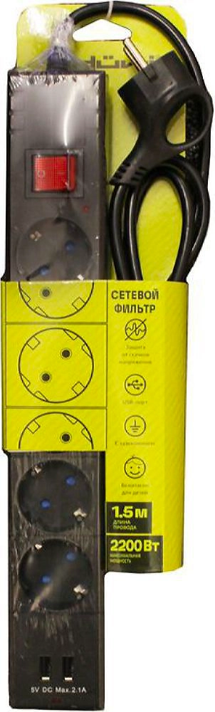 Сетевой фильтр черного цвета, имеет 5 розеток с заземлением. Также в корпусе присутствует 2 USB-порта, предназначенные для зарядки различных мобильных устройств. Большая и удобная кнопка на корпусе позволяет включать и выключать сетевой фильтр не вынимая вилку из розетки. Встроенная индикаторная лампа сигнализирует о состоянии прибора. Провод оснащен литой вилкой удобной г-образной формы с заземляющим контактом. Длина провода сетевого фильтра составляет 1,5 метра. В отличие от обычного удлинителя, сетевой фильтр сглаживает импульсные помехи и скачки напряжения, обеспечивая безопасную работу бытового и офисного электронного оборудования.