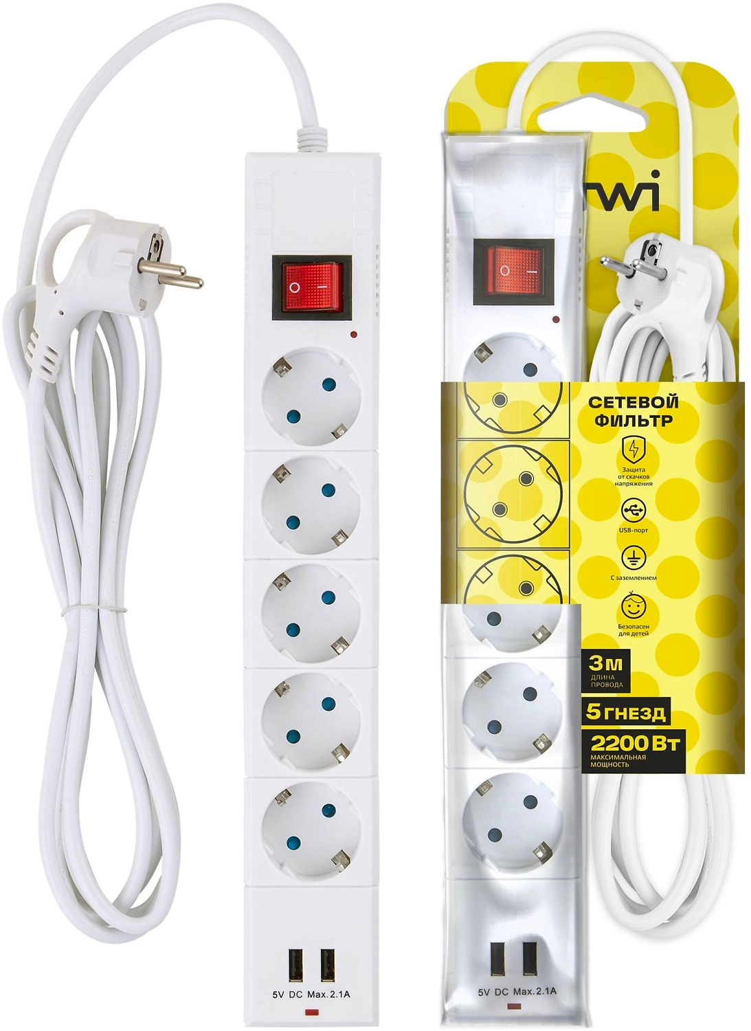 Предназначен для одновременного подключения до 5 бытовых электроприборов максимальной мощностью до 2200 Вт.