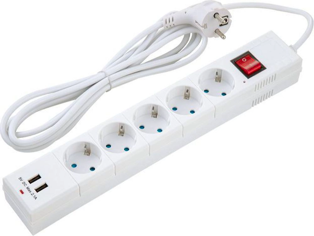 Сетевой фильтр Duwi 32592 5 5 гнезд 2200 Вт с заземлением 3 м помимо функционала сетевого фильтра и удлинителя оснащен двумя USB-портами для подключения и зарядки портативных и мобильных устройств. Выполнен в белом корпусе из пластика и оснащен защитой IP20.