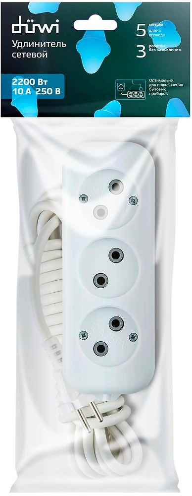 Корпус бытового удлинителя с тремя розетками сделан из диэлектрического пластика. Силовой кабель длиной 5 метров изготовлен из меди. Этот материал отличается высоким коэффициентом электропроводности. Снаружи шнур покрыт тонким защитным слоем винилового полимера.