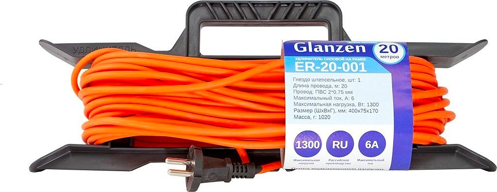 Удлинитель на рамке Glanzen ER-20-001 1 гнездо 1300 Вт 20 м