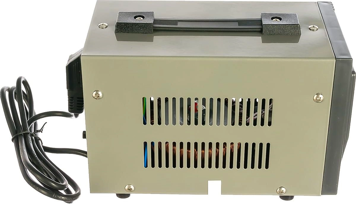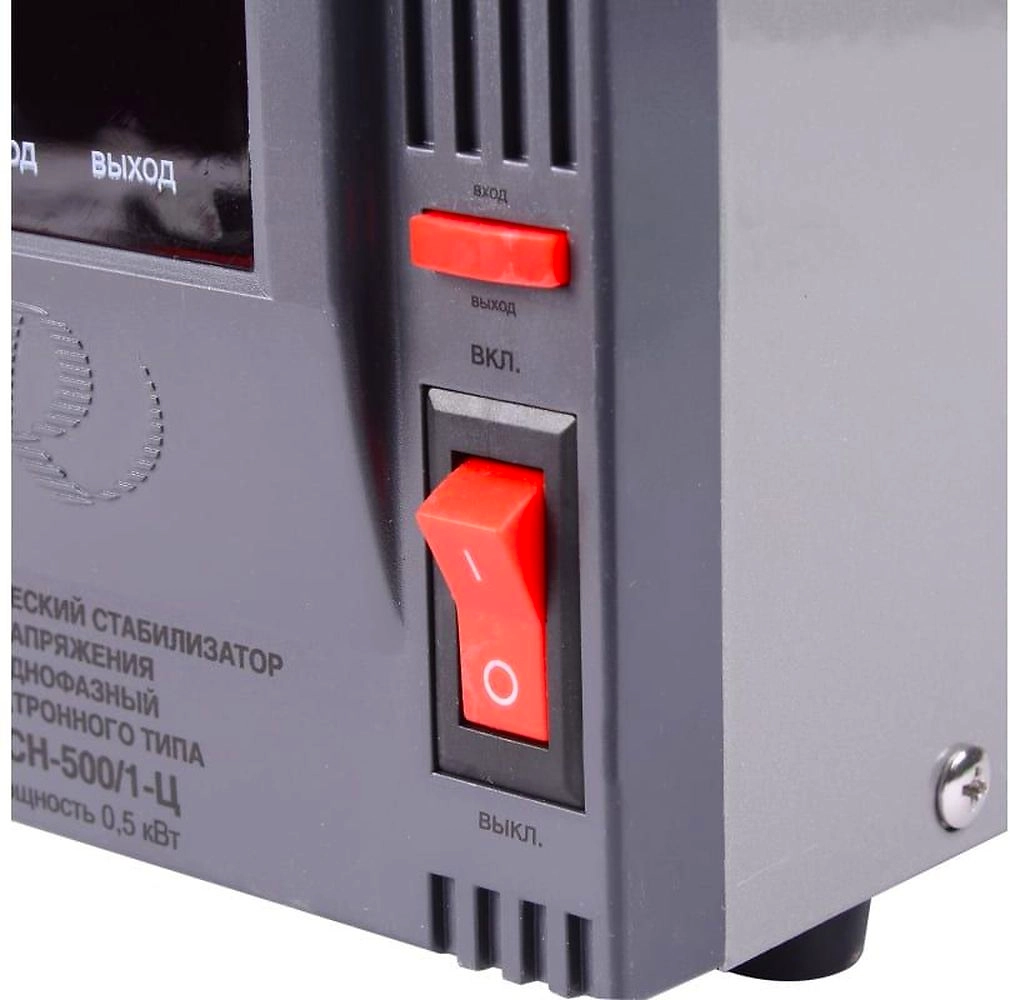 РЕСАНТА АСН-500/1-Ц – компактный стабилизатор для выравнивания входного напряжения. Защищает технику от скачков, перепадов и коротких замыканий в однофазной сети. Цифровой дисплей показывает выходное напряжение. Чтобы увидеть входное, нужно нажать на кнопку рядом с экраном. Прибор защищён от перегрева и перегрузки. Автоматически отключится при неполадках. Металлический корпус защищает внутренние узлы от повреждений. Вентиляционные отверстия охлаждают трансформатор. На корпусе есть розетка. Подключать приборы можно напрямую.
