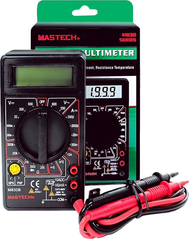 Компактный цифровой мультиметр с оптимальным набором функций. Проверка диодов и проверка транзисторов. Питание: батарея 9В типа Крона. ЖК дисплей. Щупы в комплекте.