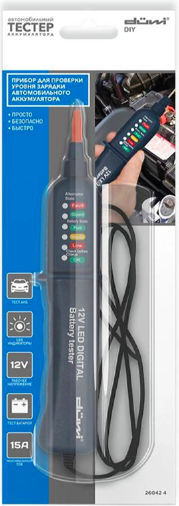 Прибор для проверки уровня зарядки автомобильного аккумулятора позволяет протестировать заряд аккумуляторной батареи и проверить генератор. Рабочее напряжение - 12 В, максимальный ток - 15 А.