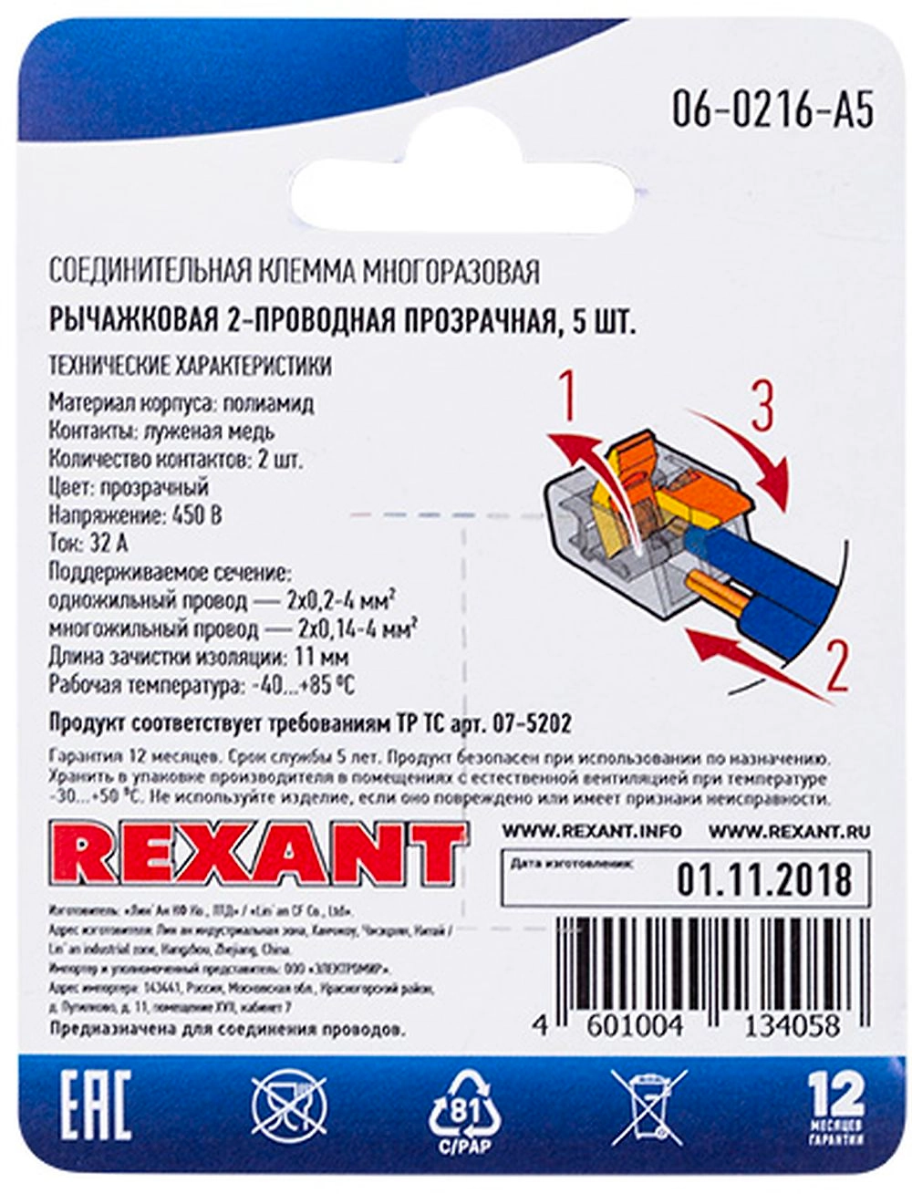 Клемма REXANT рычажковая 2 провода 4 кв.мм 5 шт