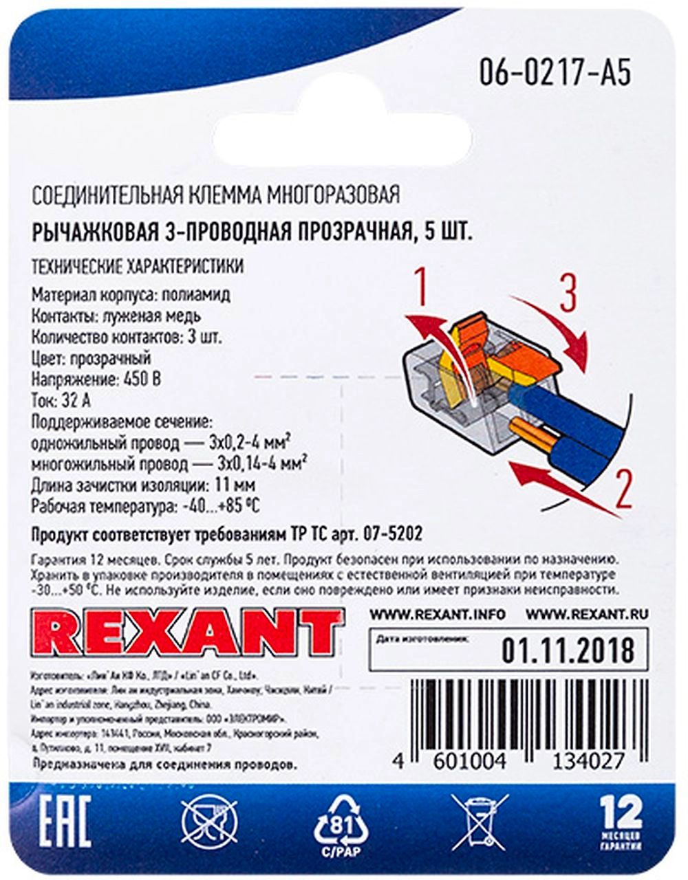 Клемма REXANT рычажковая 3 провода 4 кв.мм 5 шт