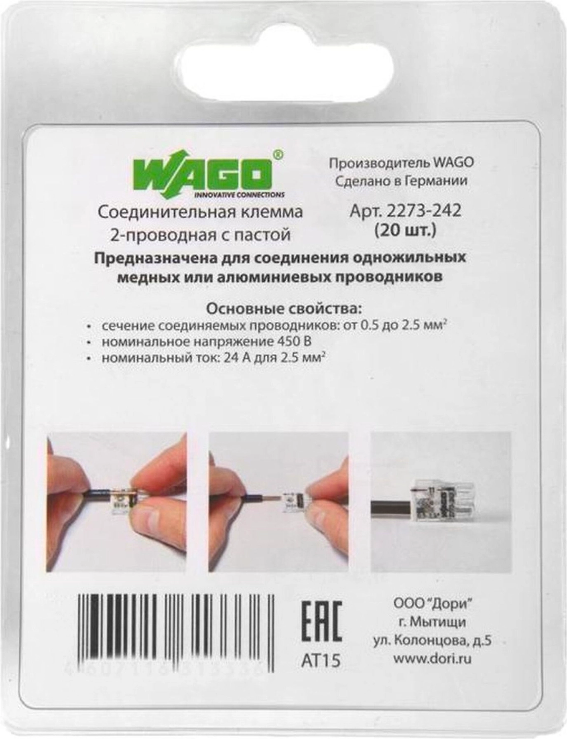 "Экспресс-клеммы Wago предназначены для надежного и быстрого соединения алюминиевых или медных проводов с одножильной или многожильной структурой. Удобные тестовые гнезда, прозрачный корпус и смотровое окно способствуют эффективной и безопасной работе. Для организации быстрого и прочного соединения достаточно вставить жилу кабеля или провода в клемму и самозажимной механизм надежно зафиксирует соединение. Клемма соединительная облегчает и ускоряет монтаж при устройстве электропроводки, подключении фурнитуры и осветительных приборов. Предназначена для соединения проводов и кабельных жил из алюминия и меди. Возможность одновременного подключения проводников различного сечения (от 0,5 до 2,5 кв.мм), номинальный ток до 24 А и понятная цветовая маркировка для быстрого доступа. Прозрачный корпус позволяет визуально контролировать правильность монтажа. Вы можете использовать прозрачный порт для проверки правильности зачистки изоляции с целью обеспечения защиты от случайного контакта. Тестовые разъёмы оптимизированы для всех стандартных измерительных щупов. Особенности: каждый проводник имеет отдельное клеммное место и не повреждается в процессе монтажа, уникальная цветовая маркировка каждого типоразмера клемм, конструкция клемм предусматривает возможность монтажа проводов различных сечений от 0,5 до 2,5 кв.мм в одной клемме, прозрачный корпус позволяет контролировать глубину захода жилы, на каждой клемме нанесена разметка длины зачистки проводников, конструкция корпуса клемм предусматривает тестовые гнезда, оптимизированные под все стандарты измерительных щупов, гарантированная надежность контактов, исключающая короткое замыкание и разогрев в точке соединения, монтаж не требует использования инструментов, контактная паста снимает окисную пленку с алюминиевых проводов и предохраняет их от повторного окисления"