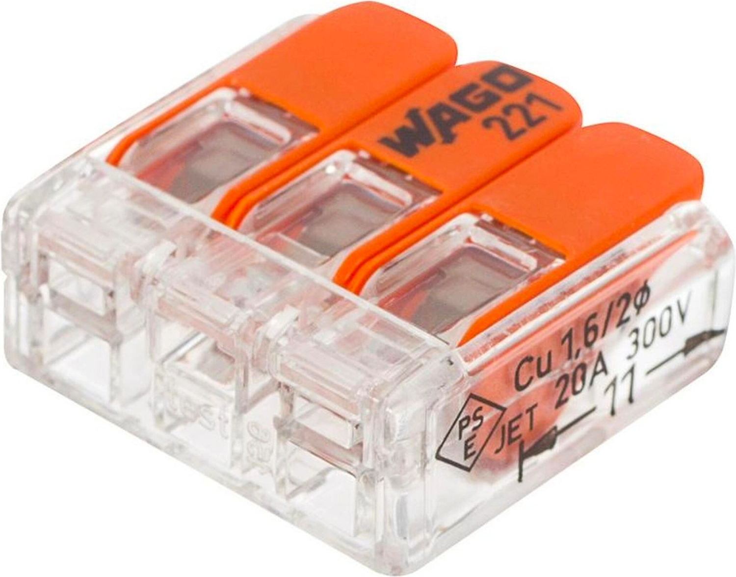 "Соединительные клеммы Wago предназначены для подсоединения до трех проводов. Модель отличается удобным самозажимным механизмом, простотой монтажа и хорошими техническими характеристиками. Клеммы изготовлены из высококачественного материала. Подходят для одножильных и многожильных проводов. Благодаря своим компактным размерам клеммы WAGO идеально подходят для применения в условиях ограниченного пространства. Монтаж значительно облегчается, также обеспечивается дополнительная свобода для будущих расширений. Прозрачный корпус, чтобы видеть правильно ли подсоединены проводники и на правильную ли длину они зачищены. Кроме того, два легко доступных тестовых гнезда (одно в направлении входа проводника, одно в противоположном направлении) обеспечивают условия для простого тестирования даже после монтажа. Соединители используются для соединения проводников сечением от 0,14 до 4 кв.мм, а также одножильных и тонкожильных проводников сечением от 0,2 до 4 кв.мм. Поэтому они идеально подходят для соединения проводников различного сечения и типов друг с другом. Луженые токопроводящие стержни обеспечивают стабильное, газонепроницаемое и надежное соединение проводников. Не предназначены для монтажа проводов с алюминиевыми жилами, а также не предназначены для проведения работ при открытом монтаже на улице, так как не обладают достаточной защитой от воды (IP20). При монтаже на улице клеммы должны быть защищены монтажными коробками, электрическими щитками, корпусами приборов или аналогичными устройствами с соответствующим классом защиты. Особенности: прозрачный корпус для визуального контроля позволяет проверять, правильно ли вставлены проводники и на правильную ли длину они зачищены, простота в обращении, два тестовых гнезда для всех стандартных измерительных щупов"