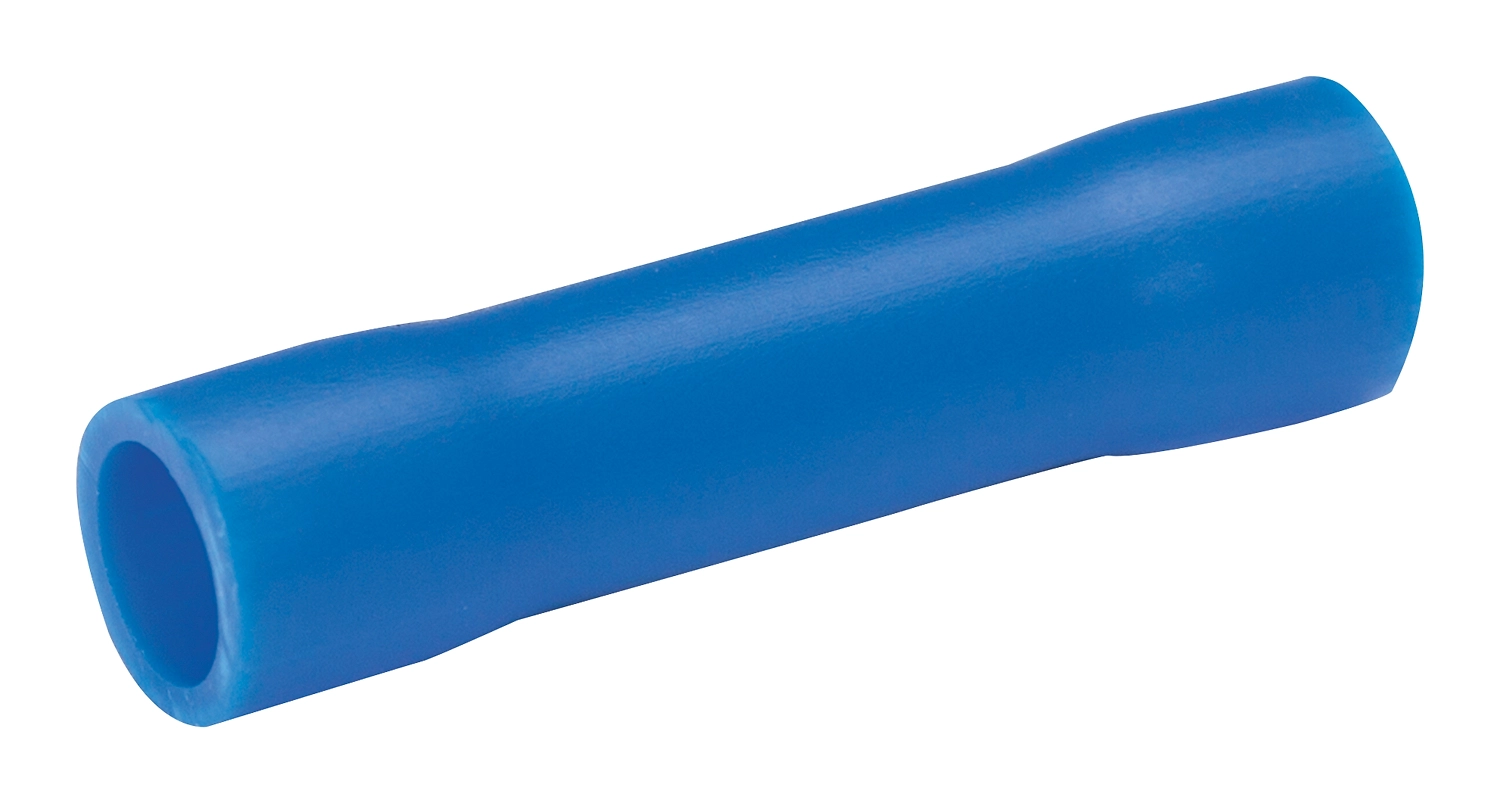 Стыковой соединитель OBI из латуни/олова оснащен изолирующей синей гильзой из ПВХ, используется для оконцевания жил кабелей и проводов с сечением жил 1,5-2,5 кв.