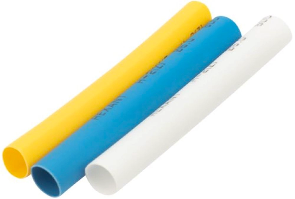 Состав: Радиационно-сшитый полиолефин 1. Горючесть: не поддерживает горение 2. Относительное удлинение при разрыве: не менее 200% 3. Температура усадки минимальная: 110 С 4. Температурный диапазон в режиме эксплуатации: -40...+125 С 5. Прочность на растяжение: не менее 10.4 МПа 6. Электрическая прочность: не менее 19.7 кВ/мм 7. Рабочее напряжение: 600 В 8. Удельное электрическое сопротивление: 1014 Ом/см 9. Наполнение: 1,5/0,75 мм – 30 мм (белый\*20 шт., черный\*20 шт., желтый\*20 шт., синий\*20 шт.) 2,5/1,25 мм – 30 мм (белый\*13 шт., черный\*13 шт., желтый\*13 шт., синий\*13 шт.) 3,5/1,75 мм – 60 мм (белый\*13 шт., черный\*13 шт., желтый\*13 шт., синий\*13 шт.) 4,0/2,0 мм – 60 мм (белый\*8 шт., черный\*8 шт., желтый\*8 шт., синий\*8 шт.) 5,0/2,5 мм – 60 мм (белый\*6 шт., черный\*6 шт., желтый\*6 шт., синий\*6 шт.) 6,0/3,0 мм – 60 мм (белый\*5 шт., черный\*5 шт., желтый\*5 шт., синий \*5 шт.) 8,0/4,0 мм – 65 мм (белый\*4 шт., черный\*4 шт., желтый\*4 шт., синий \*4 шт.) 10,0/5,0 мм – 100 мм (белый\*3 шт., черный\*3 шт., желтый\*3 шт., синий \*3 шт.) Рекомендуется проведение работ по усадке трубок с помощью специальных электромонтажных фенов и газовых горелок марки REXANT.