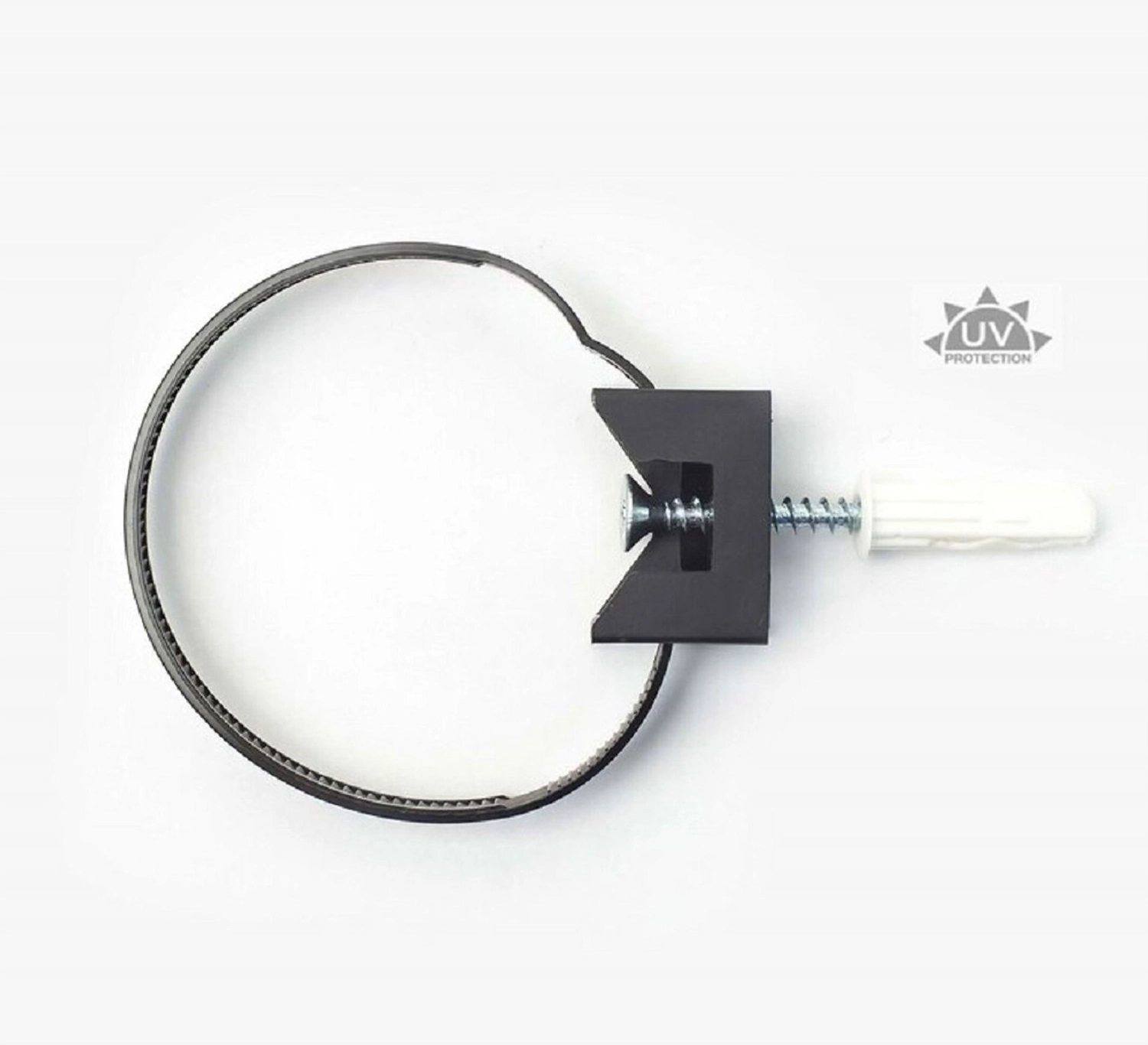 Ремешок изготовлен из прочного нейлона. Кроме того, такое приспособление устойчиво к экстремальным температурам и неблагоприятным погодным условиям, что делает ремешок прочным и долговечным. Для его монтажа используется дюбель и шуруп.