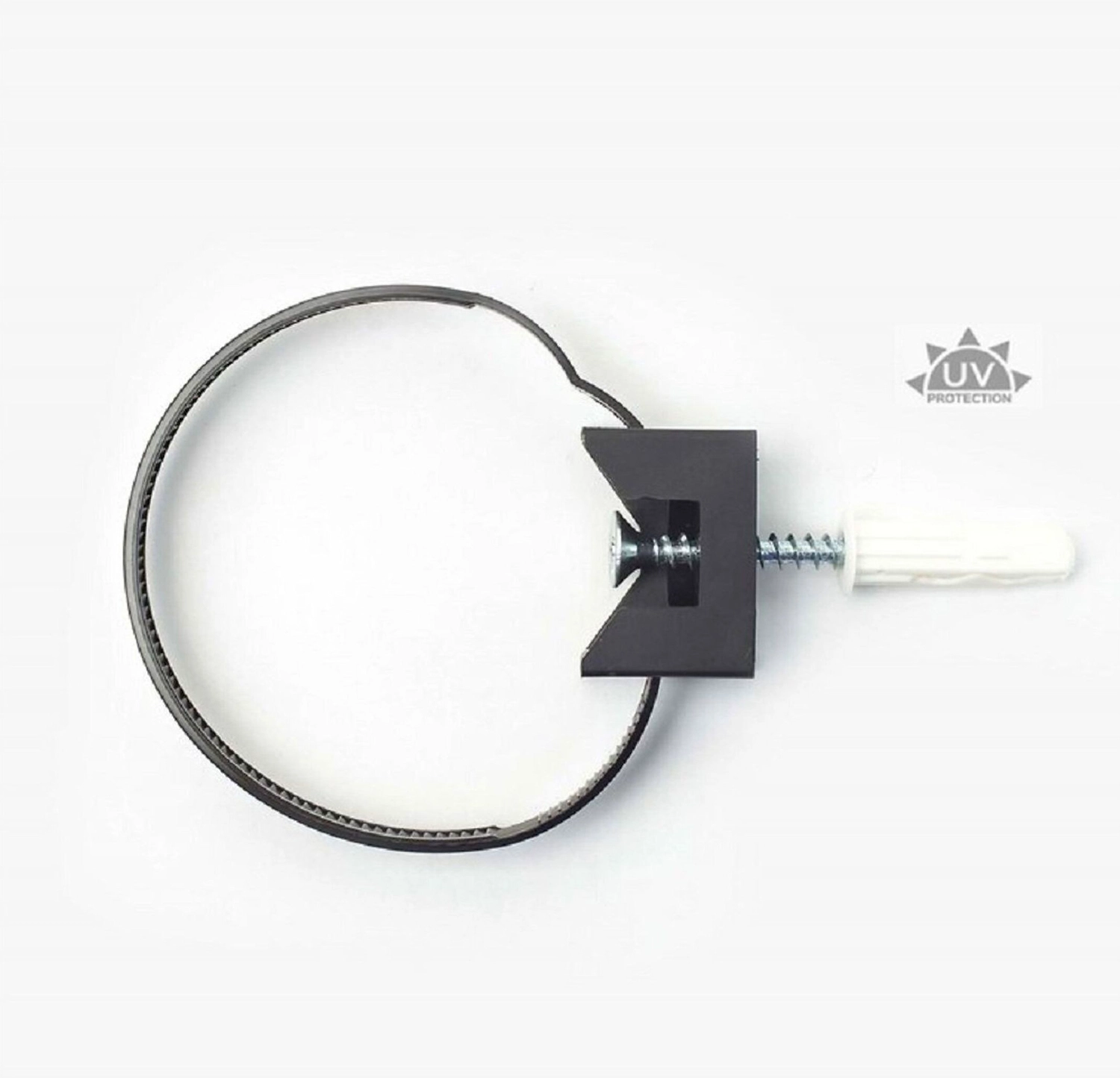 Черный ремешок может применяться внутри или вне помещений, поскольку он изготовлен из прочного нейлона. Он выдерживает заморозки или сильную жару, а также устойчив к износу. Ремешок можно устанавливать на любом основании, поскольку для его монтажа используется специальное основание под дюбель и шуруп, которые входят в комплект.
