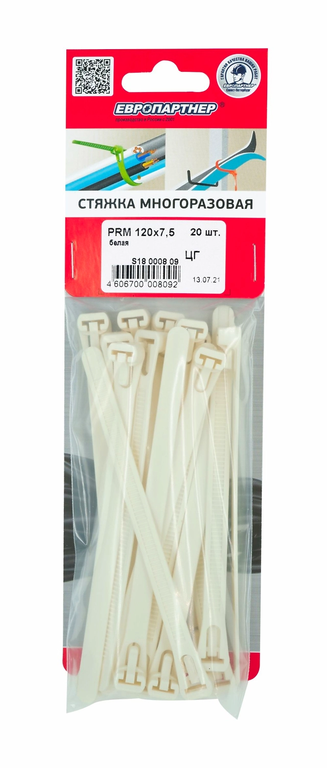 Стяжка многоразовая нейлоновая PRM 7,5х120мм, белая (20 шт.)