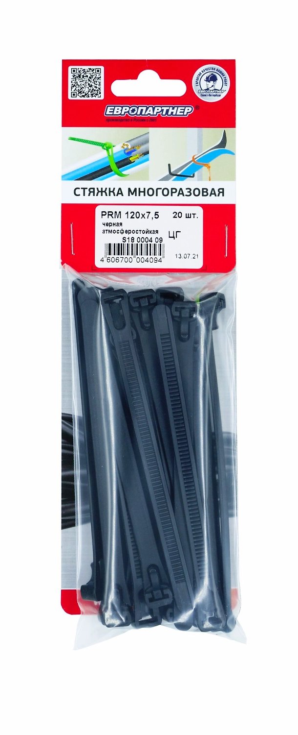 Стяжка многоразовая нейлоновая PRM 7,5х120мм, черная (20 шт.)