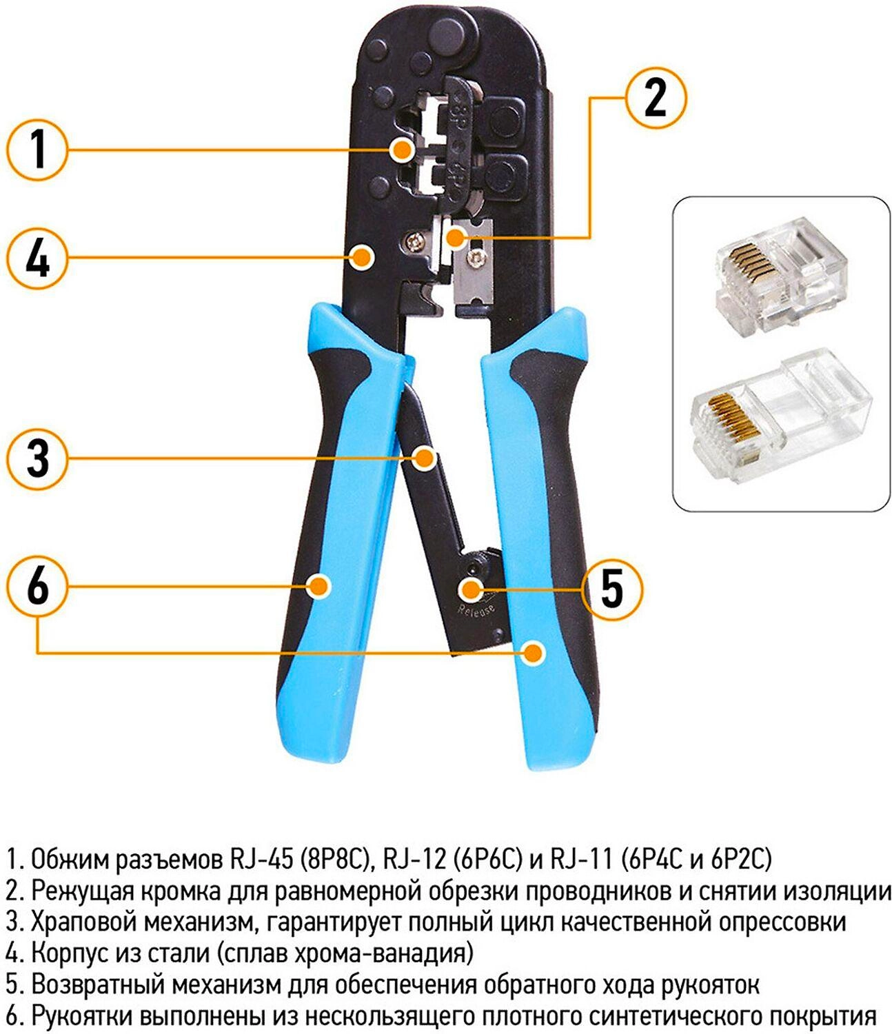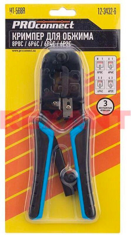 Кримпер PROconnect HT-568R — универсальный инструмент для обжима разъемов RJ-45 (8P8C), RJ-12 (6P6C), RJ-11 (6P4C и 6P2C), а также для снятия изоляции и обрезки проводов.