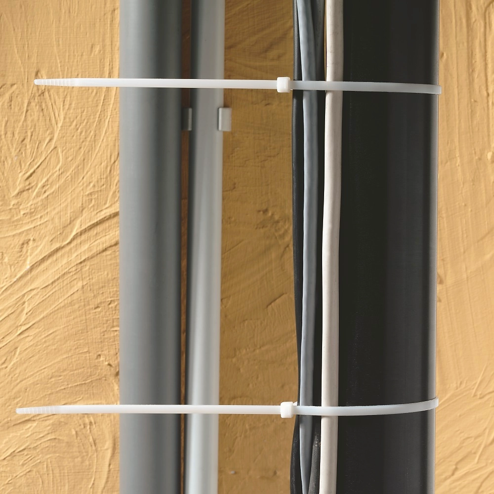 Длина этого хомута позволяет использовать его для связки толстых пучков проводов и шлангов, крепления кабелей к трубам больших диаметров и кабельным лоткам.