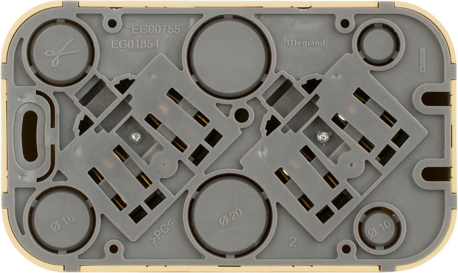 Двухместная розетка 2К без шторок, со степенью защиты IP20 может устанавливаться как вертикально, так и горизонтально