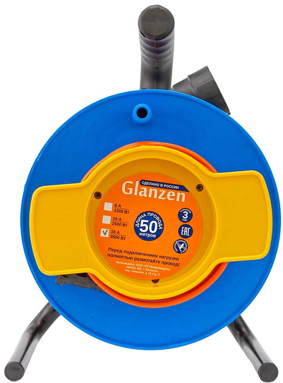 Силовой удлинитель на катушке Glanzen EC-50-003 с одним гнездом для подключения и трехжильным кабелем длиной 50 м обеспечивает работу электротехники и инструмента на удалении от источника питания.