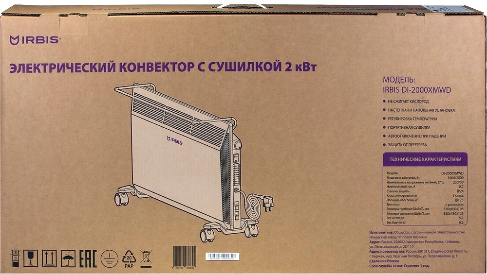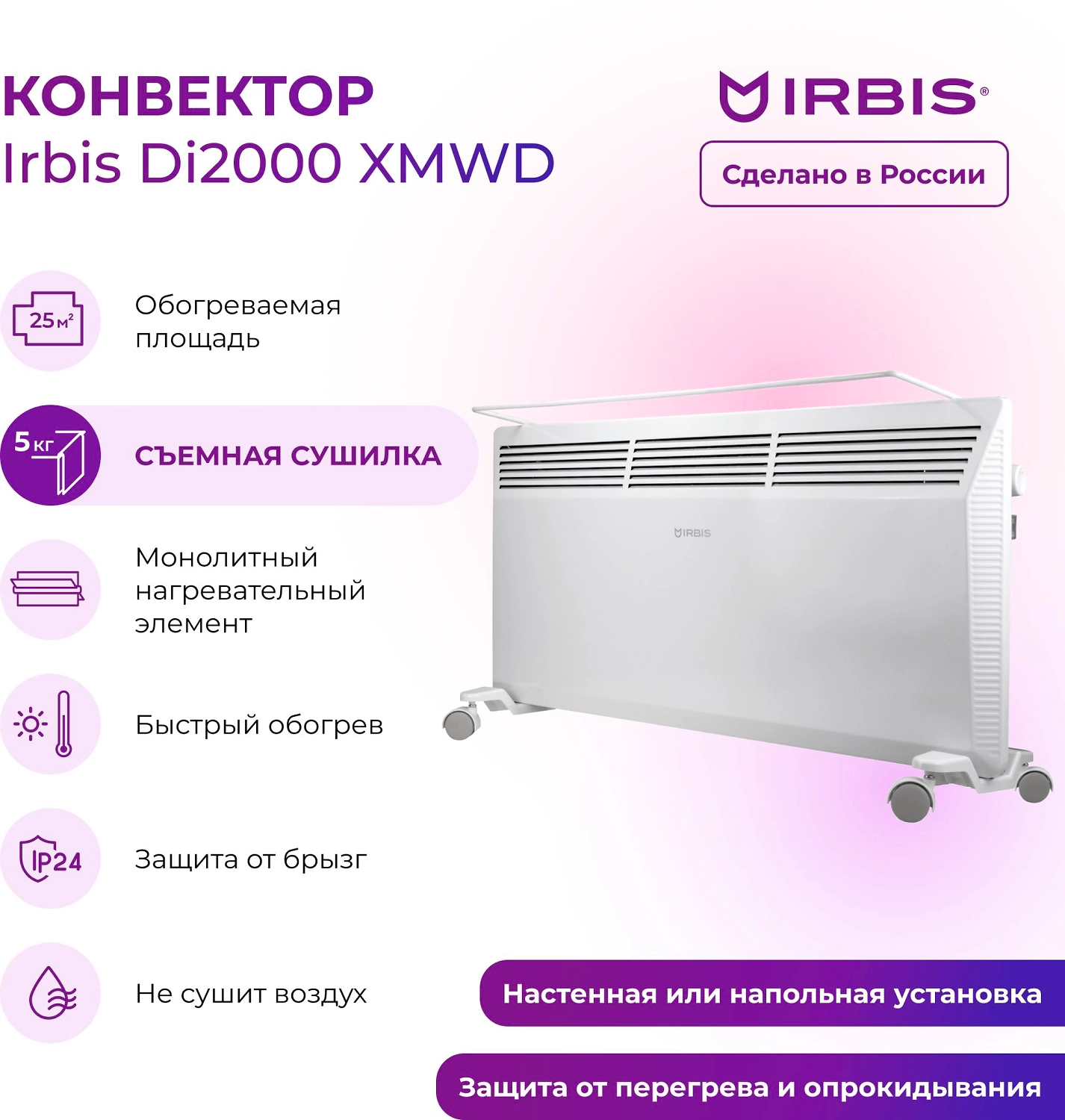 Современный компактный конвектор с сушилкой Irbis станет вашим незаменимым помощником для обогрева дома, дачи, офиса или гаража в холодное время года. Подойдет для помещения до 25 кв. м Преимущества: - мощность 2 кВт - монолитный нагревательный элемент нового поколения (не сушит воздух) - съемная сушилка для белья в комплекте (выдерживает до 5 кг) - режим полной и половинной мощности - система равномерной конвекции - датчик защиты от перегрева - датчик защиты от опрокидывания и падения - покрытие задней крышки «анти-грязь» - настенное крепление (кронштейн) и ножки с колесиками для напольной установки в комплекте - защита от брызг IP24