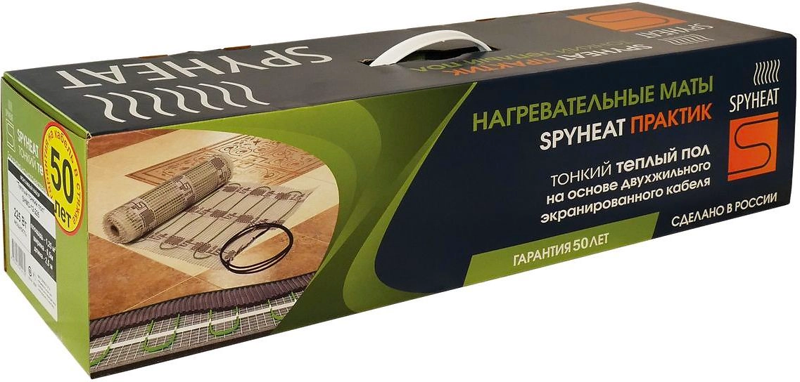 Нагревательные маты SPYHEAT Практик мощностью 180 Вт/кв.м представляют собой тонкий двухжильный экранированный нагревательный кабель, закрепленный с фиксированным шагом на теплостойкой стеклосетке шириной 50 см.