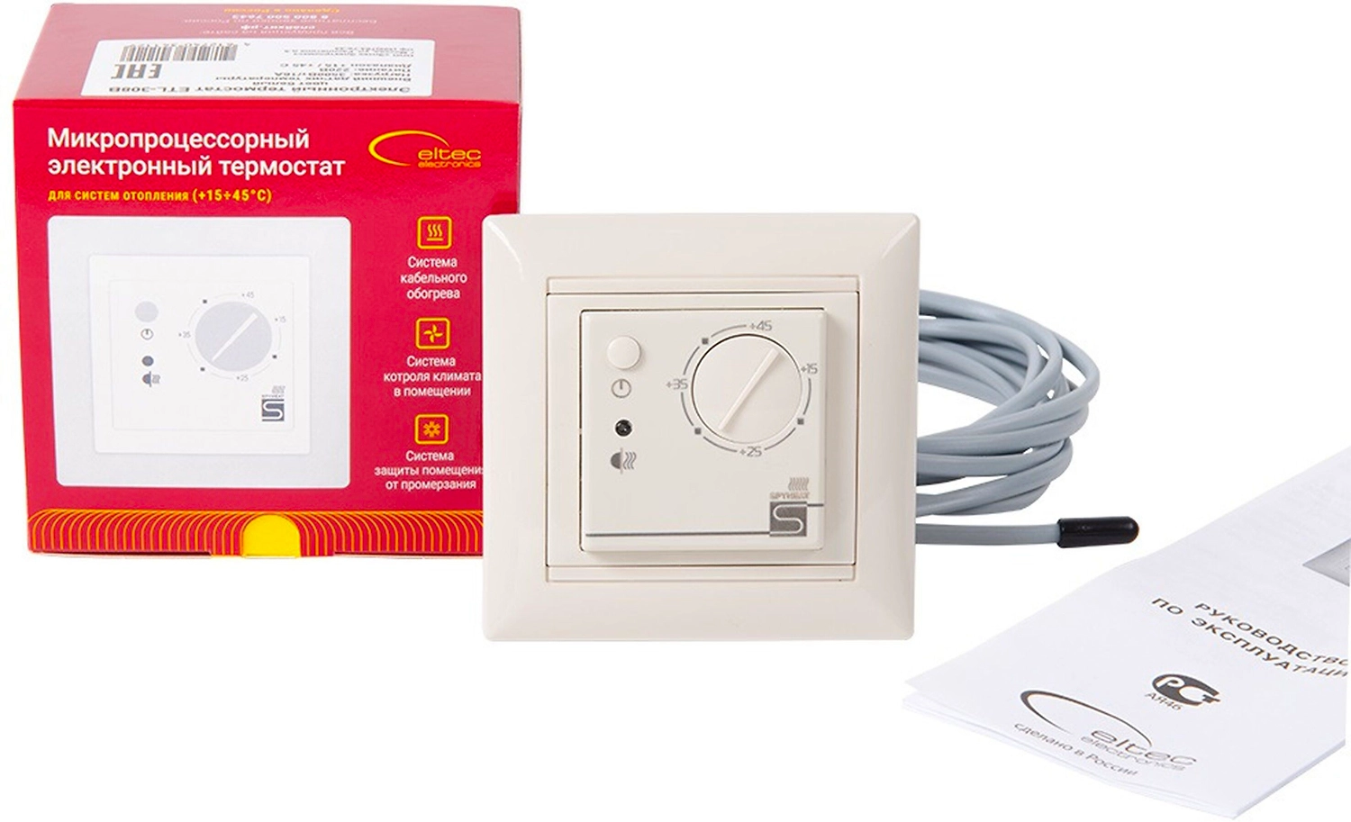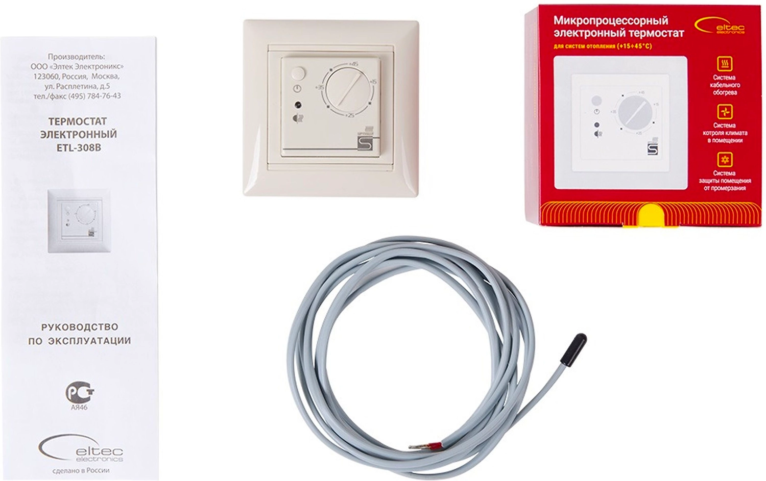 Термостат SPYHEAT ETL-308B предназначен для теплого пола и систем отопления с целью поддержания определенной температуры в помещении. Встраивается в стеновую коробку и имеет внешний датчик в пластмассовой оболочке.