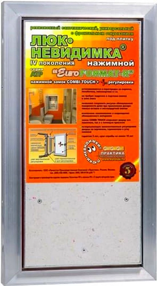 Ревизионный сантехнический Люк невидимка под плитку ЕвроФОРМАТ-Р АТР предназначен для скрытого доступа к инженерным и сантехническим коммуникациям. Наличие магнитно - нажимного замка позволяет открывать люк как нажатием, так и с помощью вакуумной присоски. Отличается от подобных изделий продуманностью каждой детали. Для успешного функционирования этот люк не требует газовых амортизаторов.