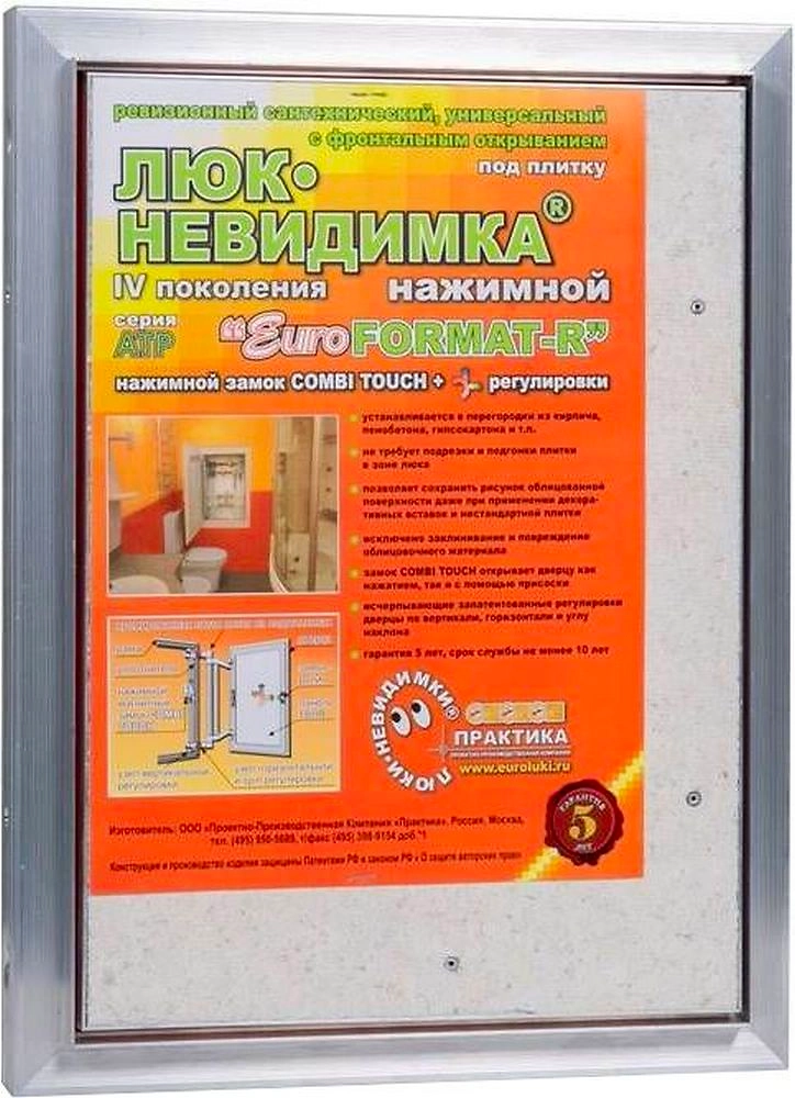 Ревизионный сантехнический Люк невидимка под плитку ЕвроФОРМАТ-Р АТР предназначен для скрытого доступа к инженерным и сантехническим коммуникациям. Наличие магнитно - нажимного замка позволяет открывать люк как нажатием, так и с помощью вакуумной присоски. Отличается от подобных изделий продуманностью каждой детали. Для успешного функционирования этот люк не требует газовых амортизаторов.