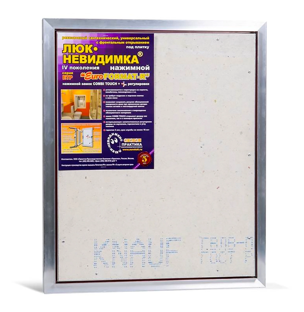 - Дверца люка "Евроформат АТР" изготовлена из высококачественного листа ГВЛВ "Кнауф", это позволяет использовать люк в помещениях с повышенной влажностью.