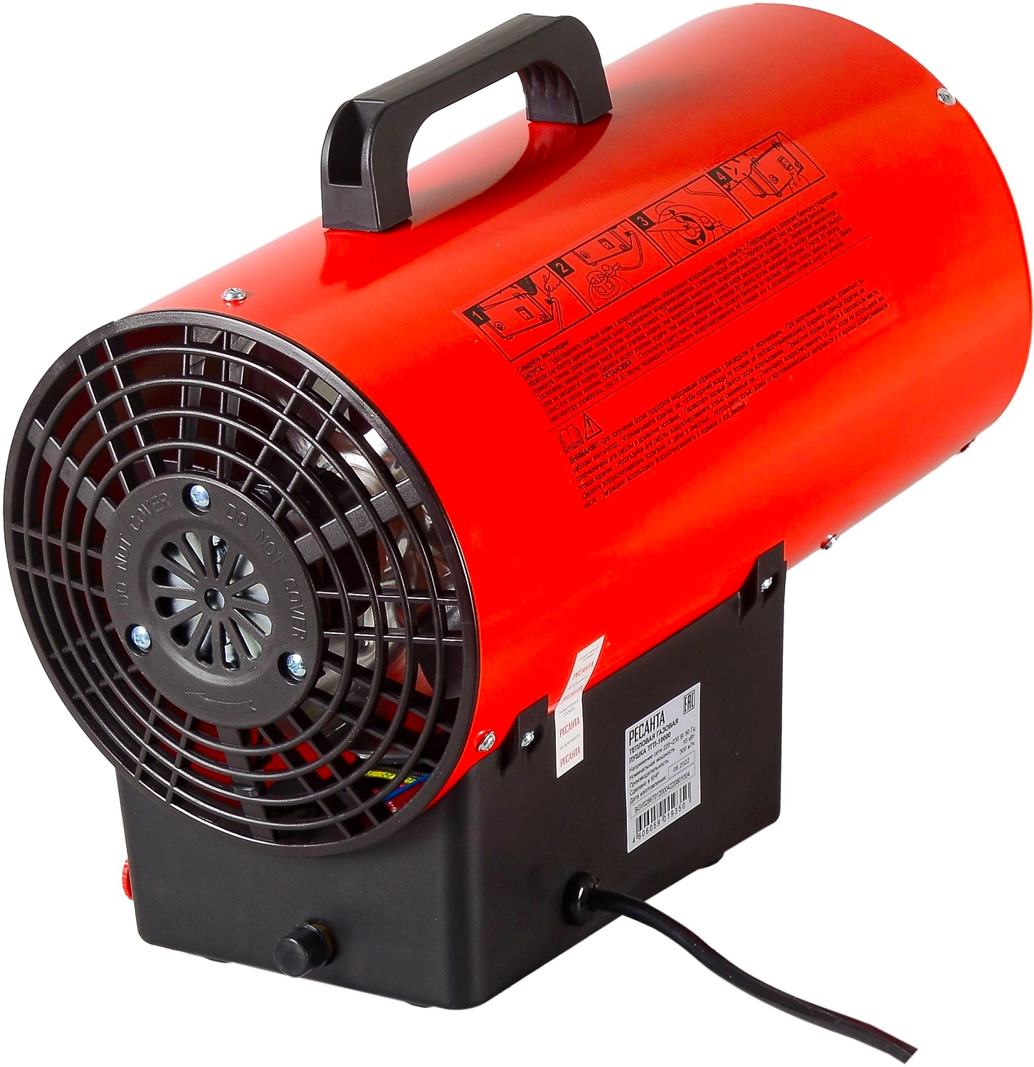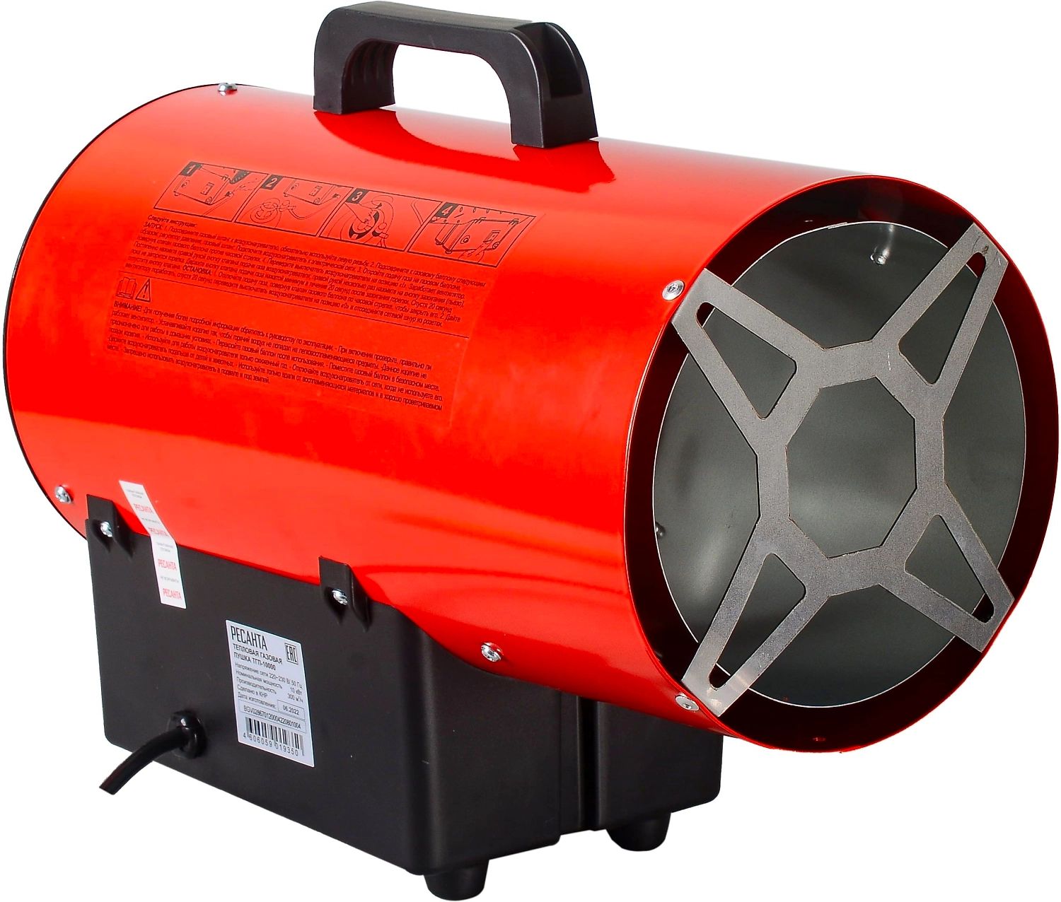 Газовая тепловая пушка РЕСАНТА ТГП-10000 - воздухонагреватель, работающий на сжиженном газовом топливе. Топливо необходимо для получения горячей атмосферы в камере сгорания, а электроэнергия, подводимая к устройству, необходима для питания вентилятора, нагнетающего воздух, и для функционирования автоматики. Газовые пушки прямого нагрева являются простой и надёжной конструкцией без дымохода, где горячий воздух из устройства поступают в помещение.