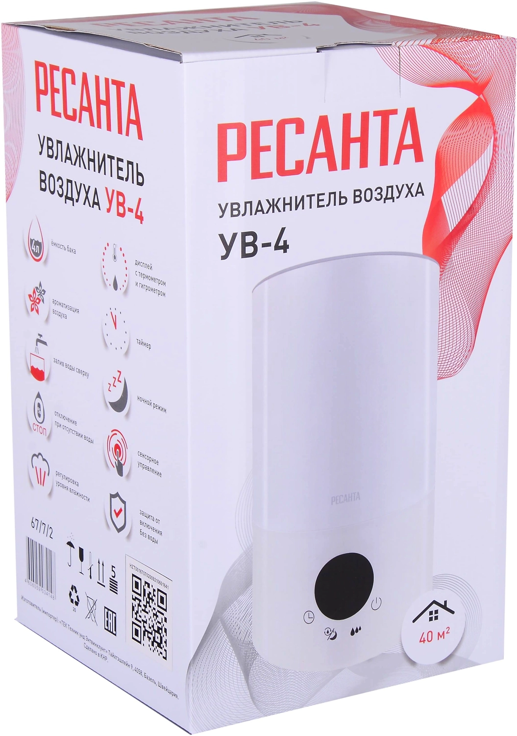 Увлажнитель воздуха Ресанта УВ-4 — прибор, предназначенный для повышения уровня влажности в помещении. В блок прибора попадает воздух из помещения. На ультразвуковую мембрану, расположенную внутри, из резервуара поступает дозированное количество воды, которая с помощью ультразвука расщепляется на мелкодисперсный пар (холодный). Данный пар с помощью воздуха через сопло поступает в помещение, повышая уровень влажности.