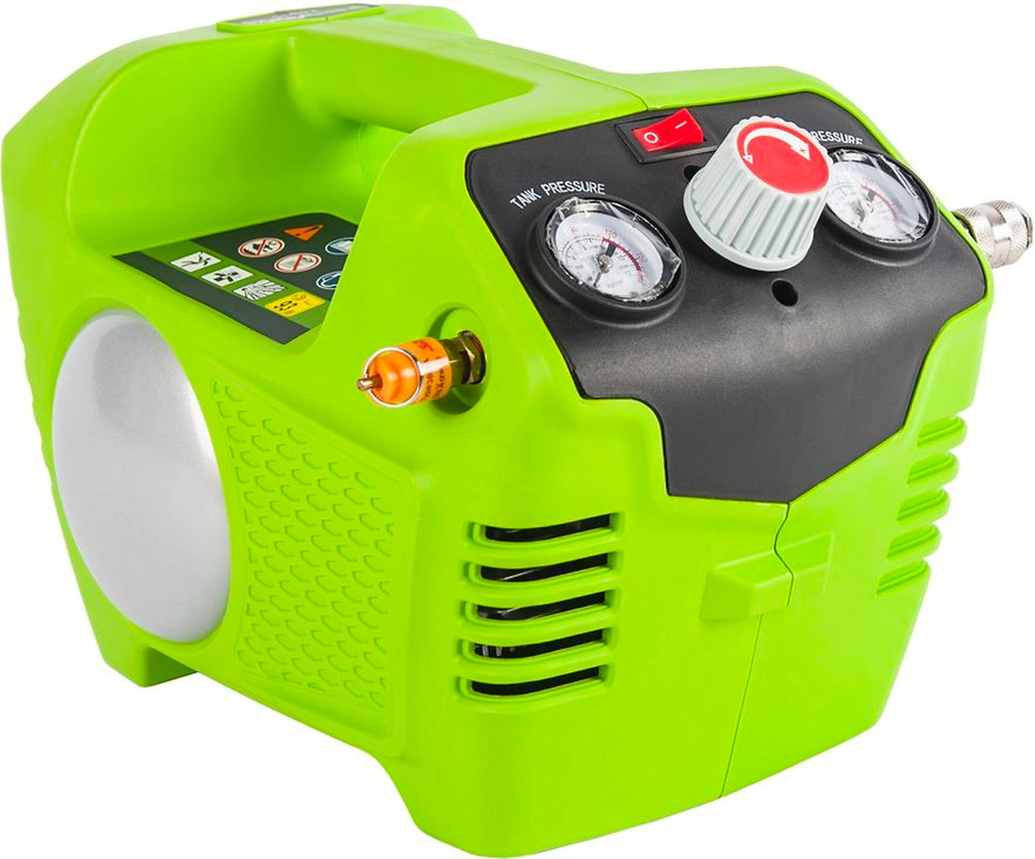 Компрессор поршневой безмасляный Greenworks G24AC 2 л - многозадачное переносное устройство оборудованное двумя манометрами и регулятором давления подаваемого воздуха.
