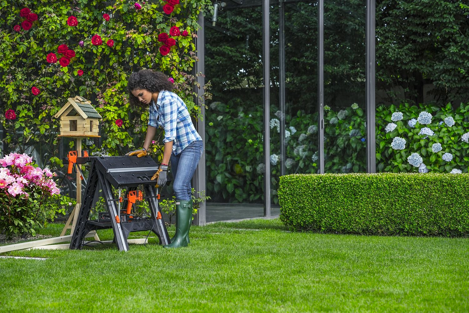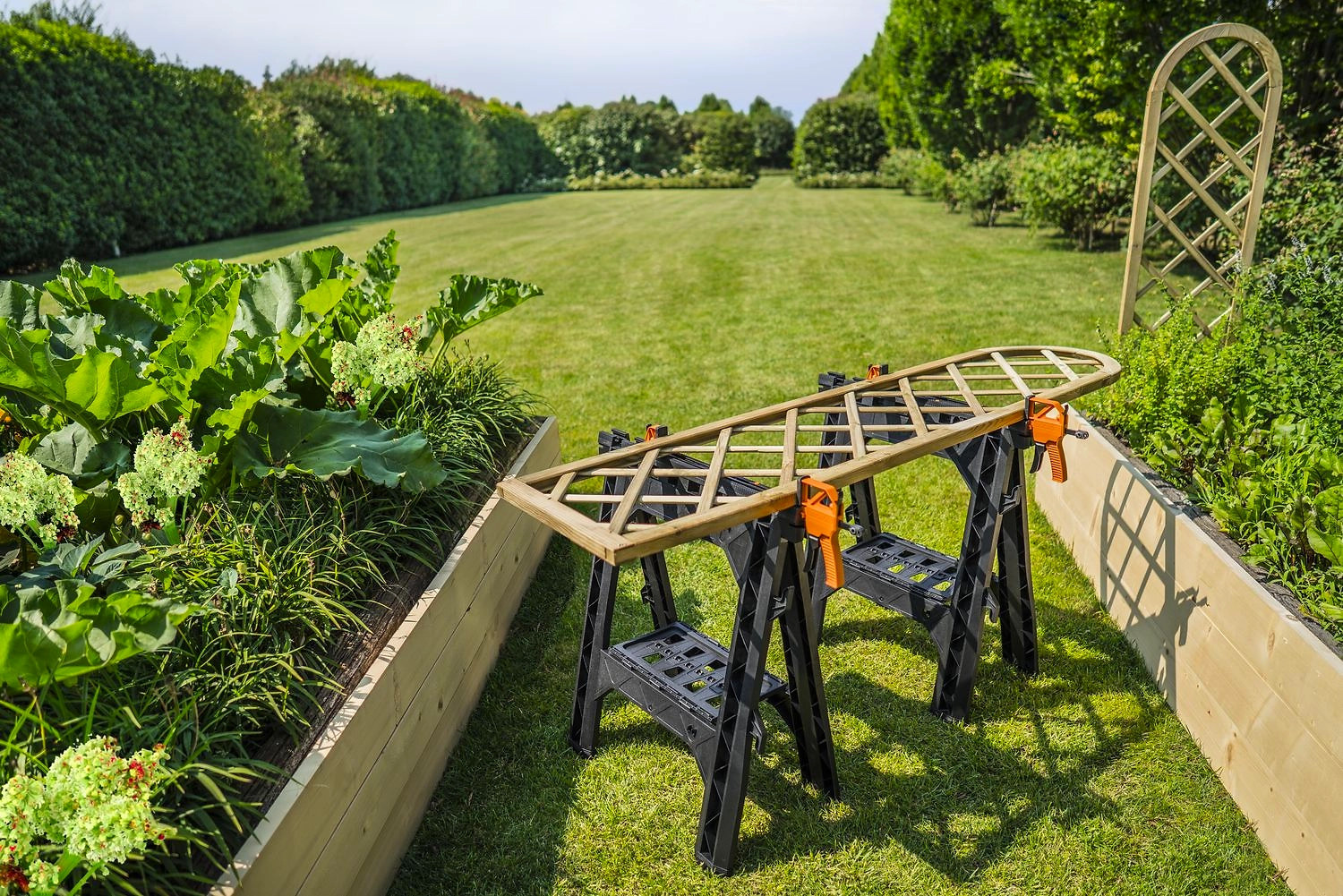 Рабочий стол можно также использовать как козлы для распила древесины, а складной лоток для хранения инструментов поможет поддерживать порядок в мастерской. Максимальная нагрузка составляет 136 кг.