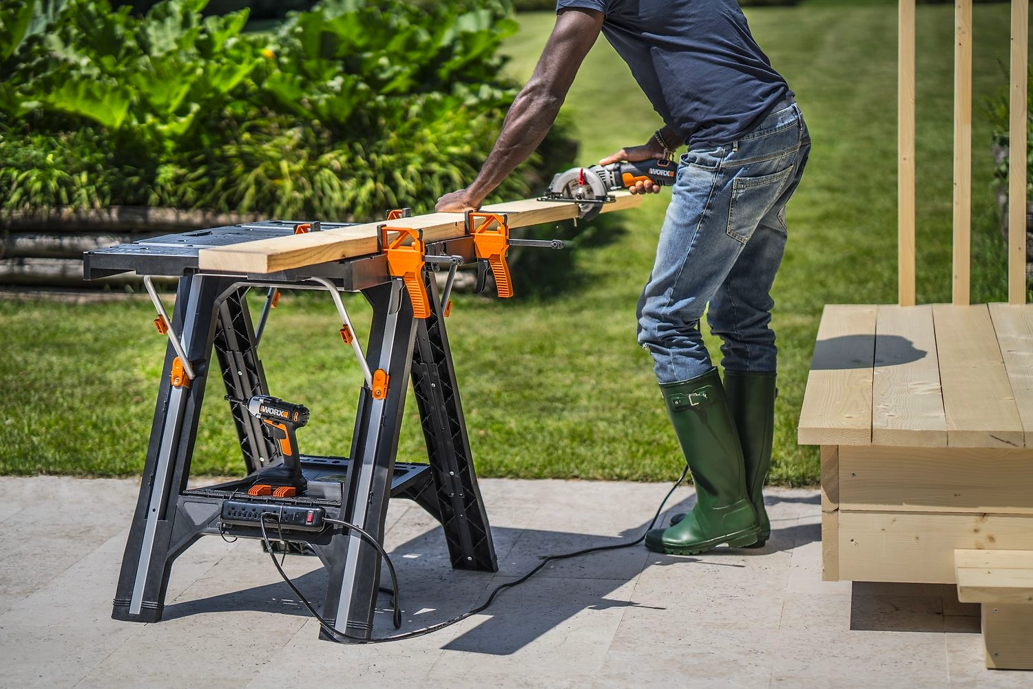 WORX WX051 универсальный рабочий стол, который может быть использован как козлы для распилки дерева. Встроенные системы зажима. Складной лоток для хранения инструментов.