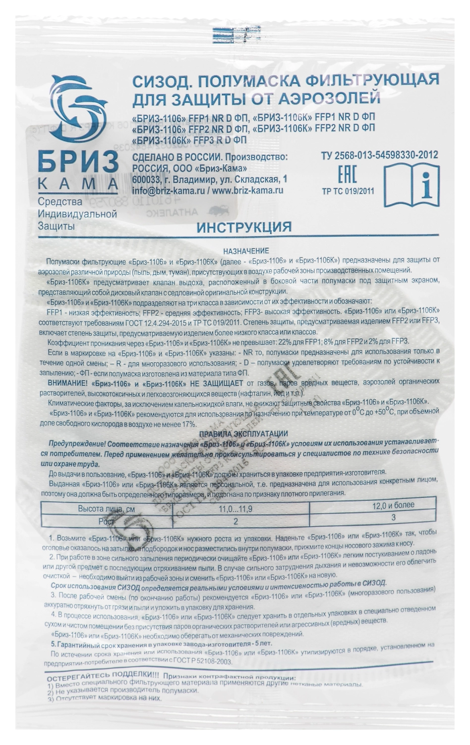 Респиратор "Бриз 1106 К" представляет из себя фильтрующую маску из нескольких слоев с носовым зажимом и эластичным оголовьем. Наружный слой изготовлен из нетканного материала плотностью 60 - 80 г/м. кв. Под ним расположен слой углеродной ткани, под которым расположен фильтрующий материал из ультратонких полимерных волокон. Внутренний слой состоит из нетканного материала плотностью 15 - 30 г/м. кв. Полумаска оборудована клапан выдоха, который расположен в боковой части под защитным экраном. Полумаска выпускается 2 размеров: 2 и 3. Цвет изделия может отличаться от партии, что не является недостатком товара.