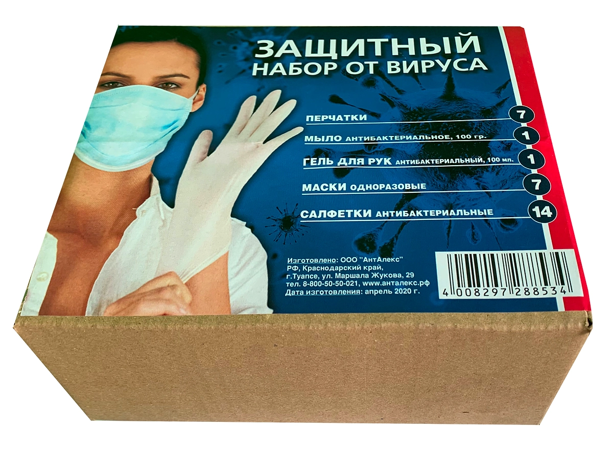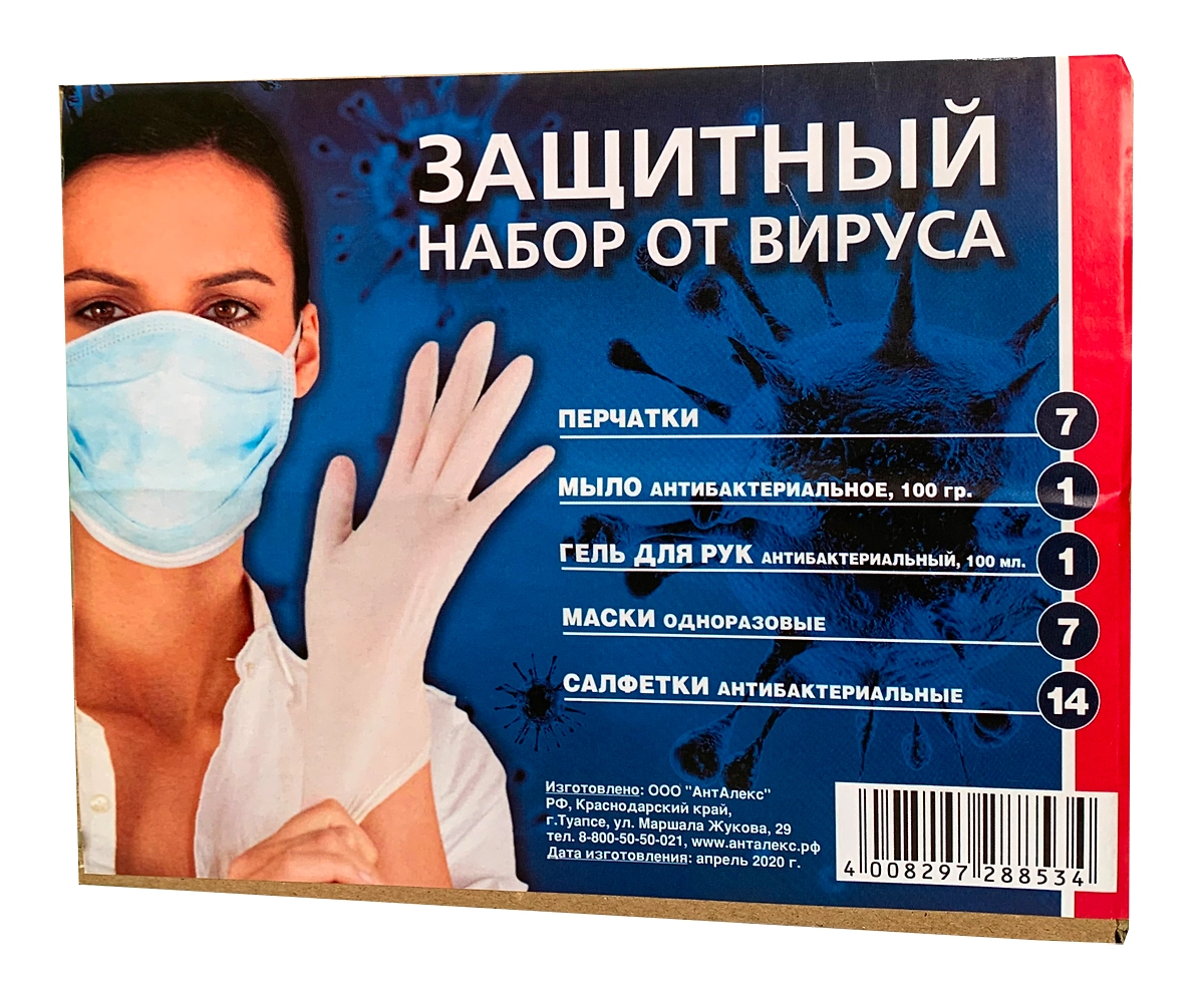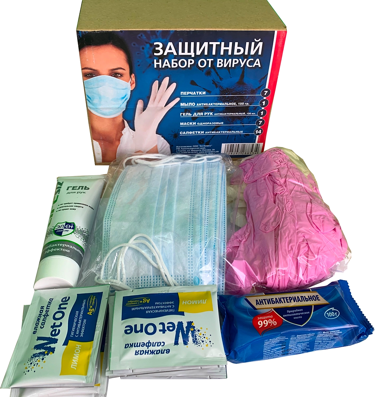 Защитный набор включает в себя все необходимое для первичной защиты органов дыхания и кожи рук от вирусов и бактерий. Рассчитан на 7 человек.