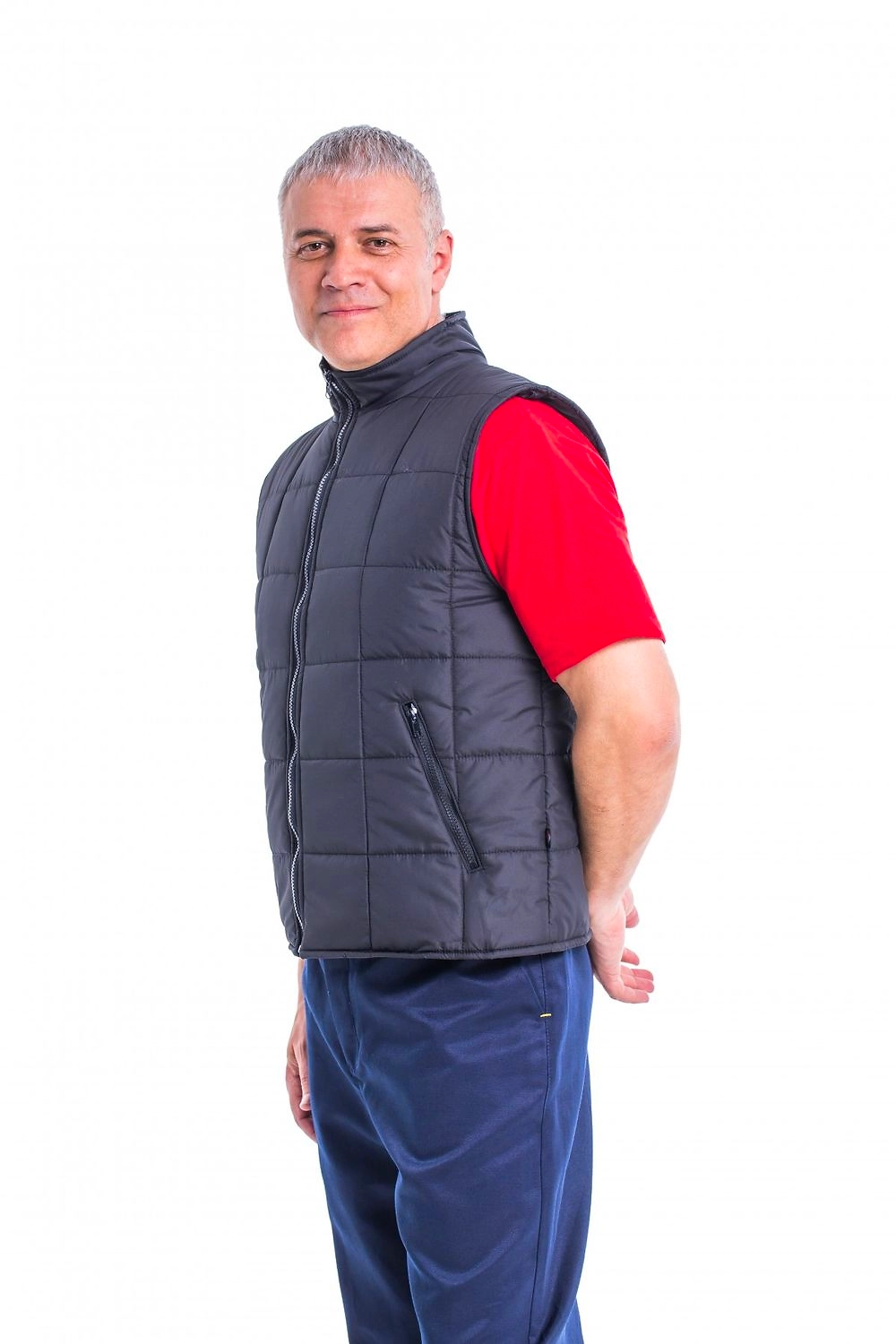 Жилет утепленный «Комфорт» 60-62. Модель жилета имеет застежку на металлической молнии. Воротник "стойка" и удлиненная спинка. У жилета два утепленных кармана по бокам с молнией.
