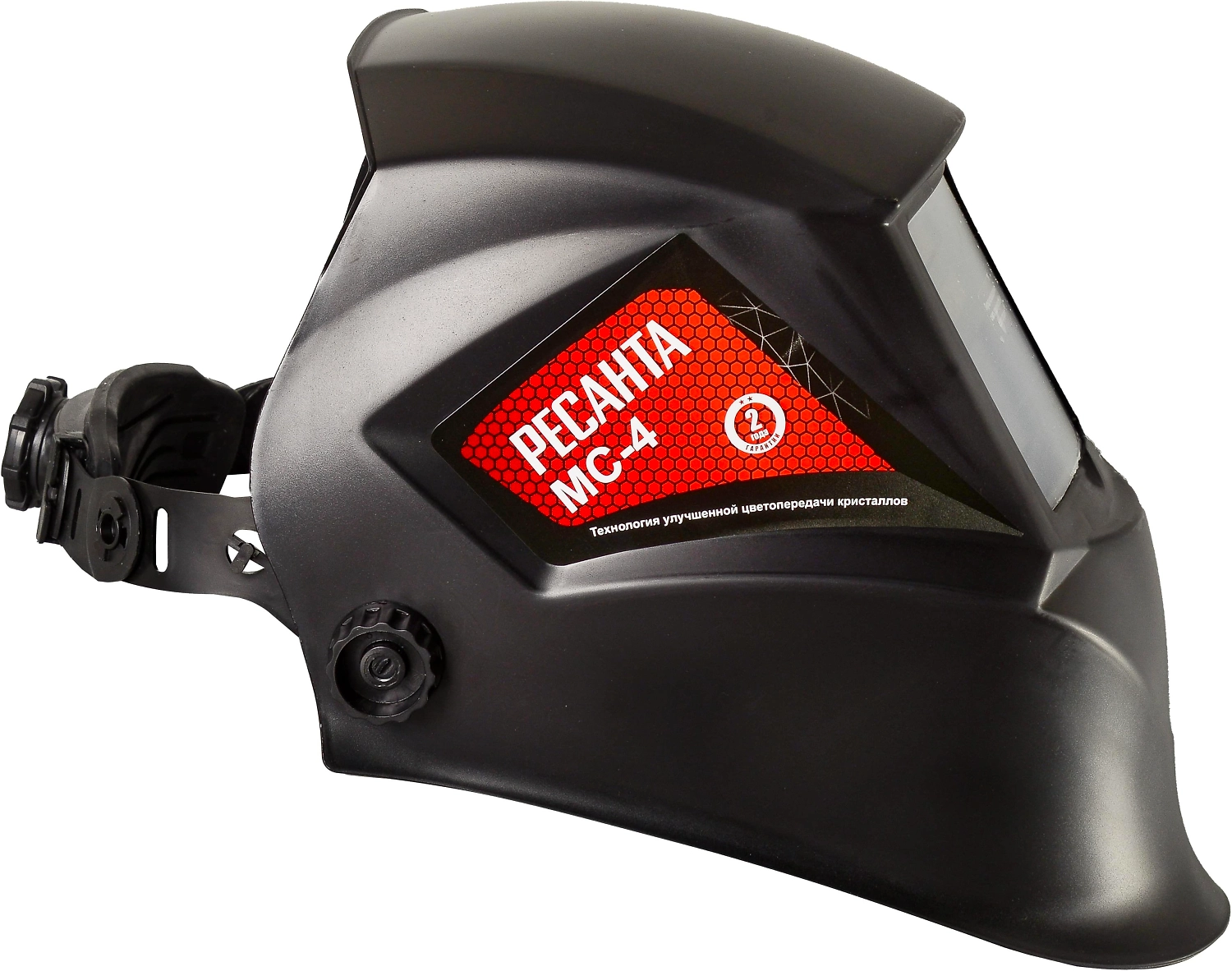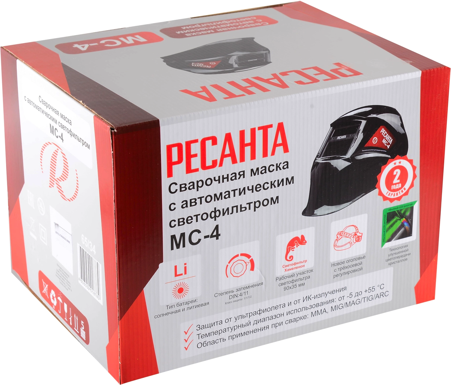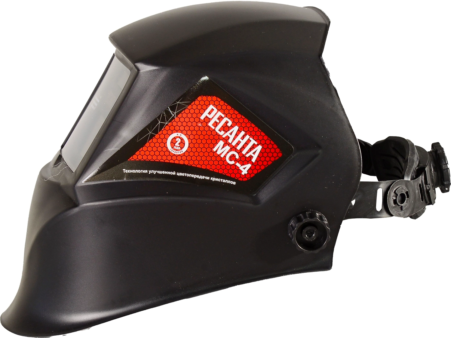 Сварочная маска РЕСАНТА МС-4 предназначена для защиты глаз от видимого, ультрафиолетового и инфракрасного излучения, а также для защиты головы и шеи от попадания искр при сварочных работах. Маска данного типа удобна, поскольку светофильтр автоматически затемняется при зажигании дуги. Такой светофильтр назвали хамелеоном из-за способности автоматически затемняться. Степень затемнения можно настраивать с помощью встроенного регулятора в зависимости от модели маски. Новое оголовье с трёхосевой регулировкой