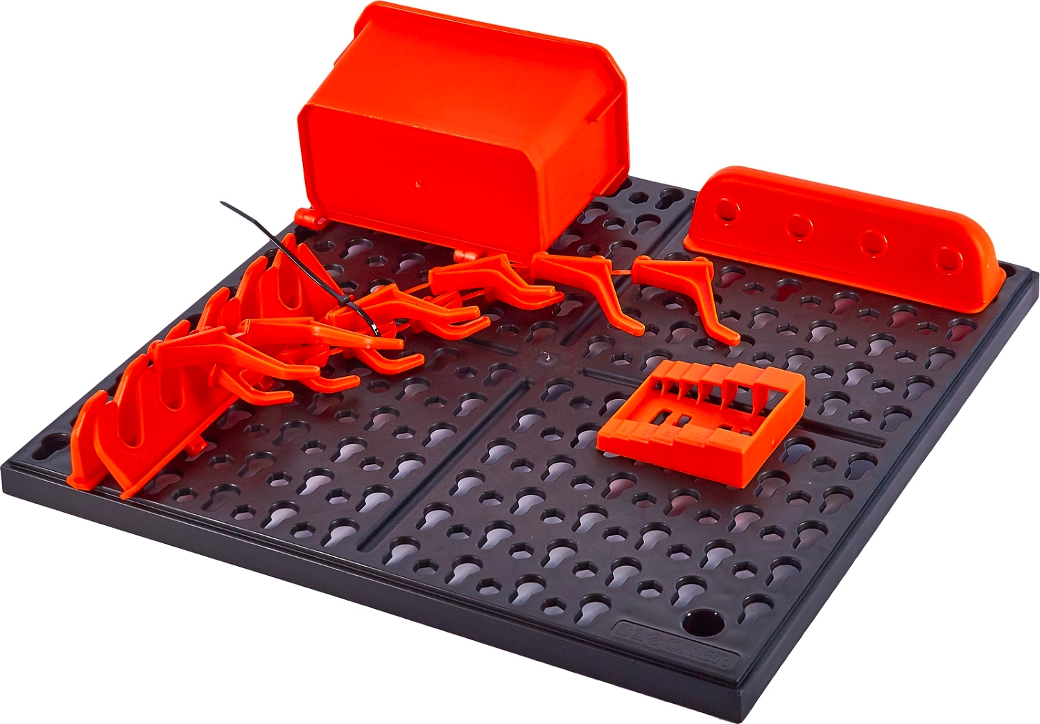 - - В комплектацию входят набор из двух типов крючков, держатели для отвёрток, свёрл, ключей и лоток для метизов. Монтаж на вертикальную поверхность осуществляется с помощью саморезов.