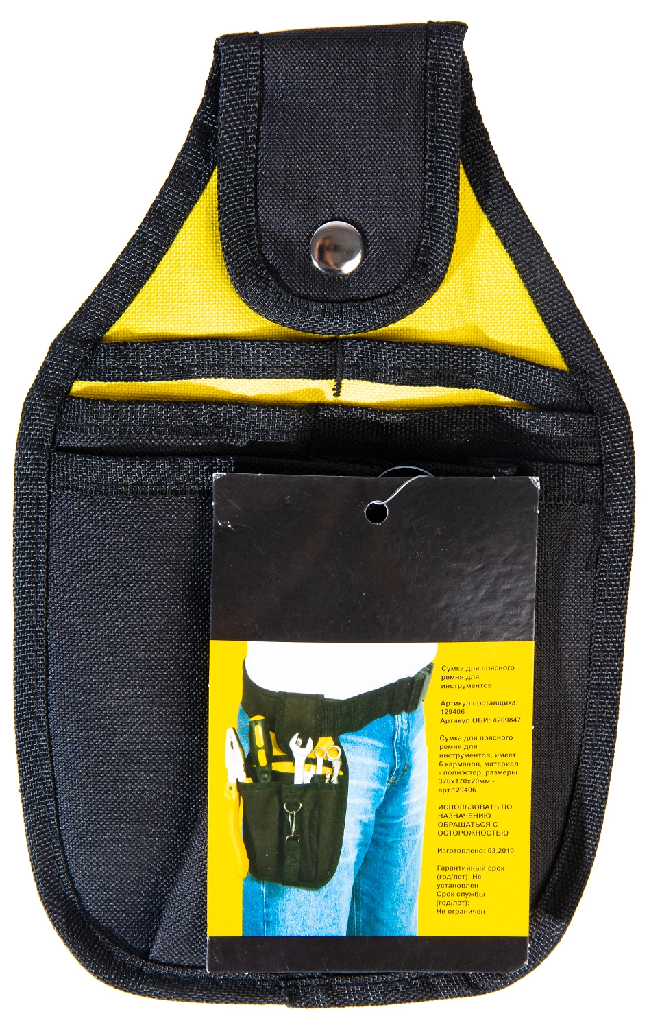 Сумка для поясного ремня для инструментов, имеет 6 карманов, материал - полиэстер, размеры 370х170х20 мм.